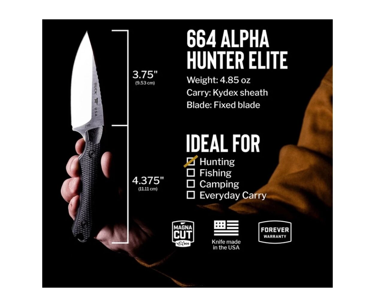 Купити ніж Buck Alpha Hunter Elite 664BKS варто кожному, хто шукає надійний і довговічний інструмент преміум-рівня. В комплекті — якісний чохол для зручного носіння.
