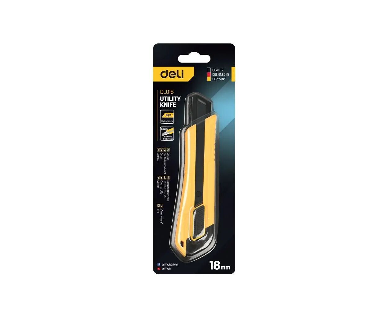 Ніж канцелярський Deli EDL018. Гострий і зручний ніж для щоденних задач. Оснащений лезом зі сталі SK2 шириною 18 мм, забезпечує точний, плавний та довговічний різ. Направляюча товщиною 0.8 мм гарантує стабільну роботу, а плоска гумова кнопка з автоматичним блокуванням додає безпеки та комфорту.