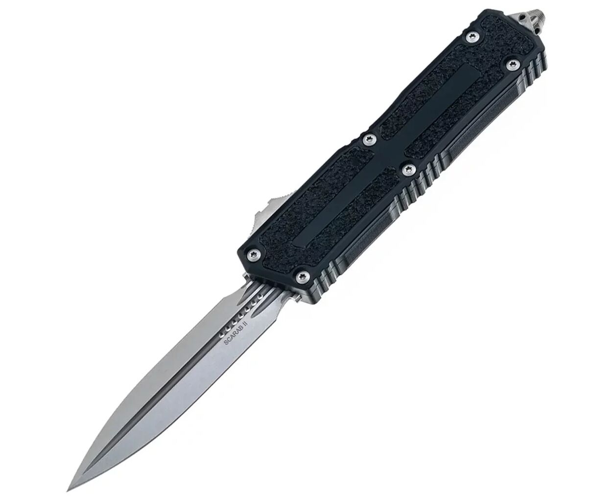 Ніж Microtech Scarab II з фронтальним викидом клинка (OTF) – це збільшена версія моделі Scarab. Крім розмірів Scarab II відрізняється більш легким і плавним ходом повзунка, який відповідає за викид клинка, форма і тип обробки якого будуть також відрізнятися в залежності від моделі. Алюмінієве руків'я з текстурованими вставками з композитного матеріалу сприяє надійнішому утриманню ножа. В моделі передбачений склобій, отвір для кріплення темляка і широка кишенькова кліпса з зображенням скарабея.