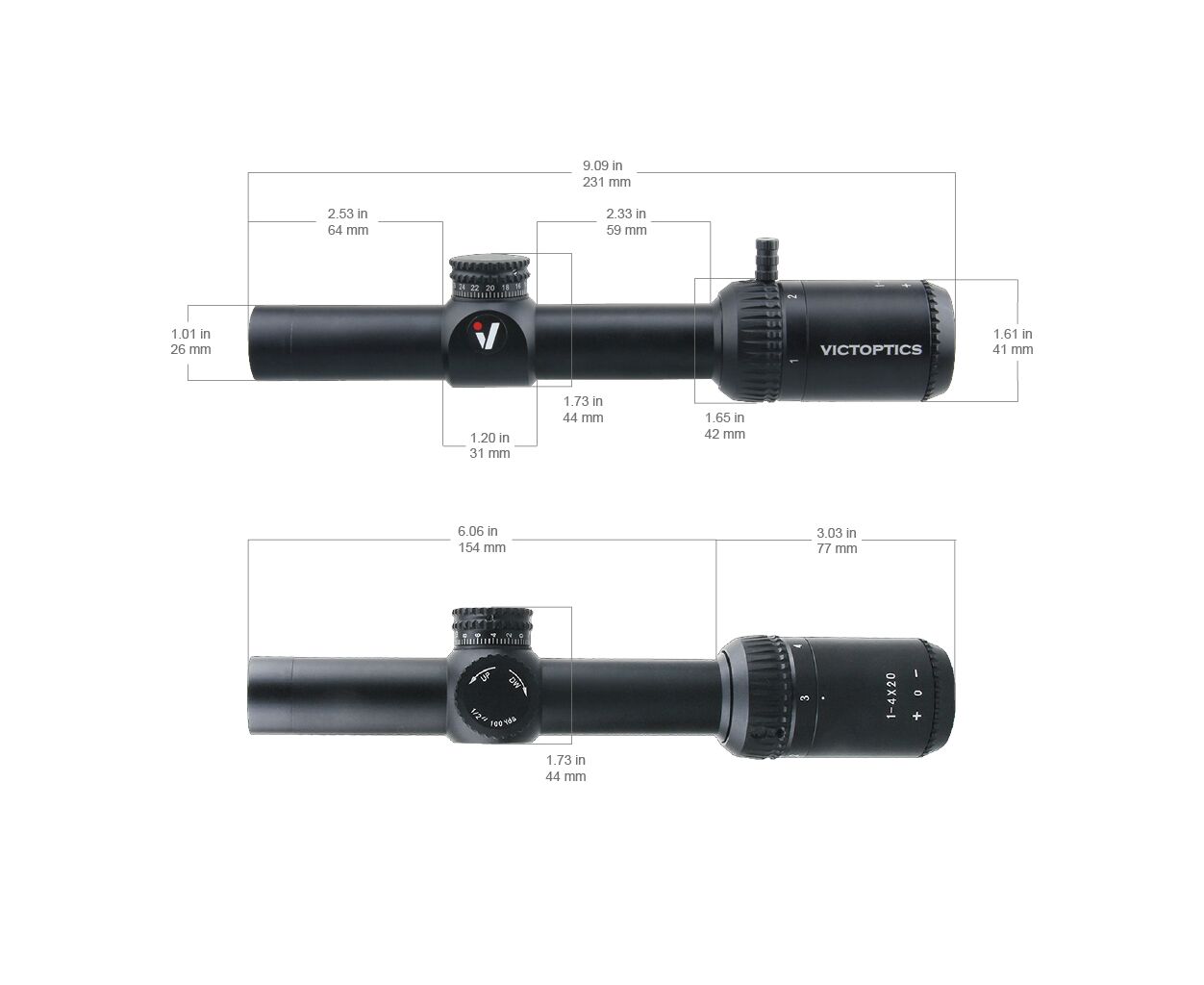 Приціл Victoptics ZOD 1-4x20 оснащений сіткою у другій фокальній площині (SFP) з підсвічуванням, механізмами введення поправок з чіткими кліками (Audible Mechanical Clicks) та кроком 1/2 MOA, а діапазон регулювань досягає 200 MOA по вертикалі та горизонталі. У комплекті передбачені відкидні кришки (Flip-up Cap), а довжина пристрою становить 235 мм за вагою 325 г.