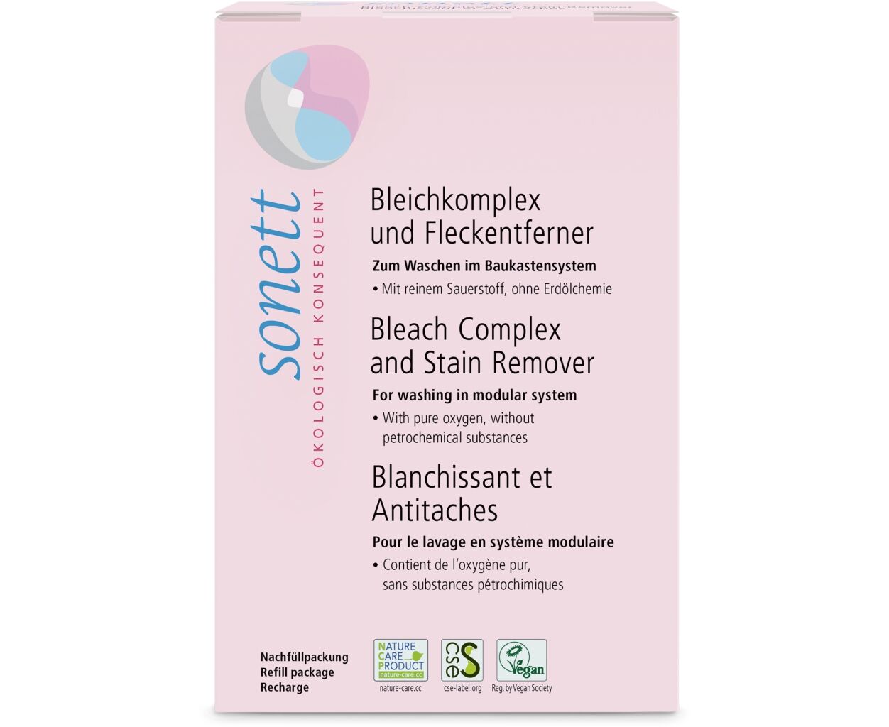 Натуральний вибілювач і плямовивідник Sonett рекомендовано додавати до основних засобів для прання Sonett: мильного порошку Sonett (для білих і стійко забарвлених тканин) і рідких засобів для прання Sonett (для білих і кольорових тканин) для видалення плям і запобігання появі сірого відтінку тканини.
