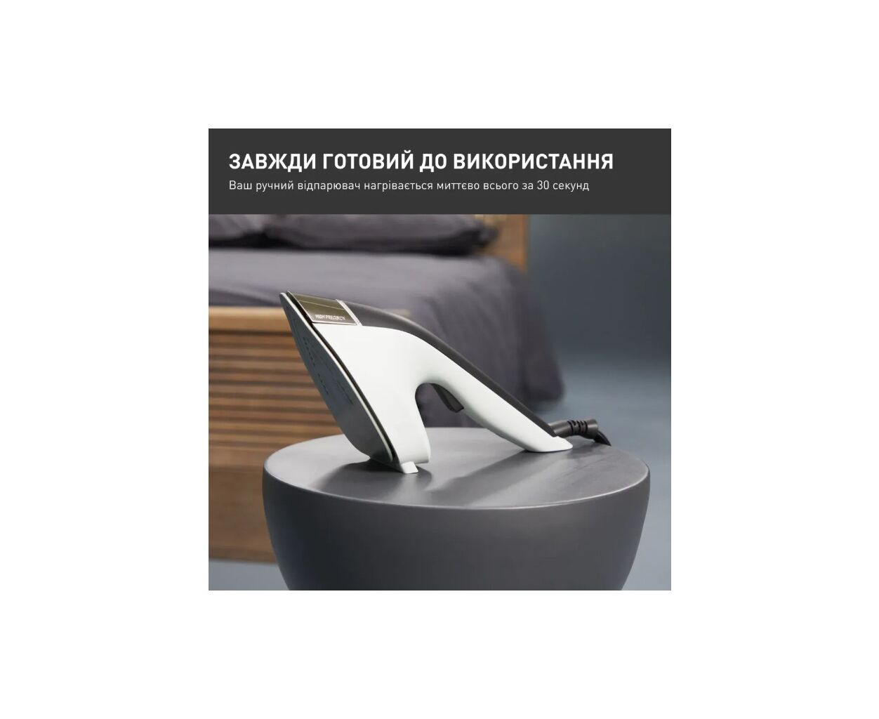Ваш ручний відпарювач нагрівається миттєво. Всього 30 секунд ― і він готовий до роботи: швидко відпарює та забезпечує відмінні результати.