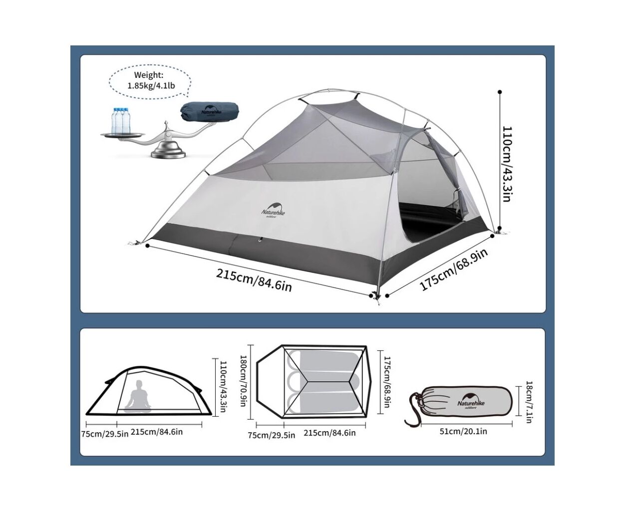 Naturehike Cloud Up 3 — намет, створений для тих, хто вирушає у тривалі піші мандрівки та хоче поєднати легкість спорядження з максимальним комфортом. Завдяки продуманій двошаровій конструкції він забезпечує надійний захист від дощу, вітру й сонця, а водночас пропонує зручний внутрішній простір для трьох дорослих.