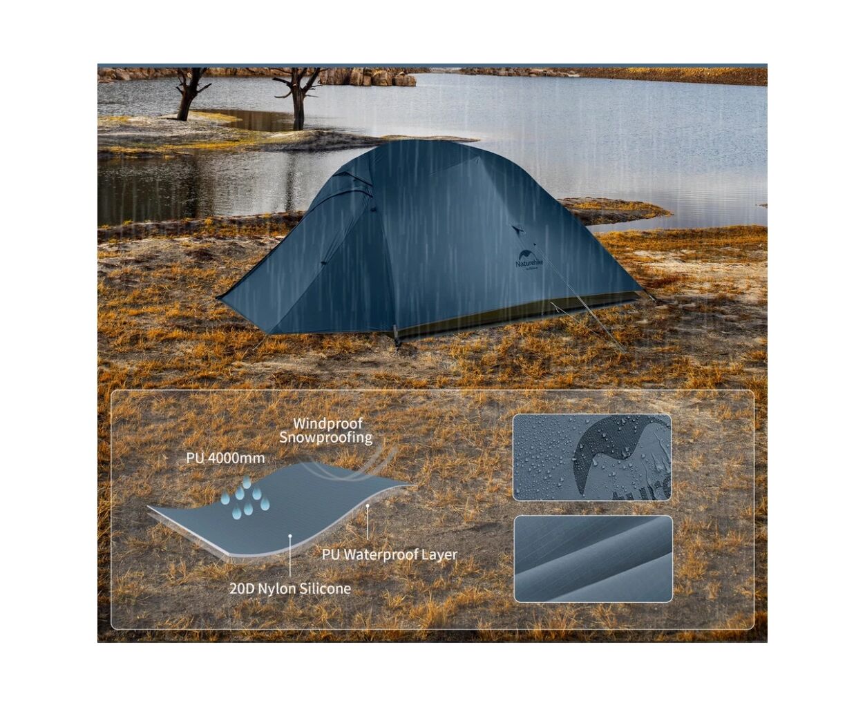 - Зовнішній тент: нейлон 20D із силіконовим просоченням (4000 мм вод. ст.) — водонепроникний, стійкий до ультрафіолету та механічного зносу.