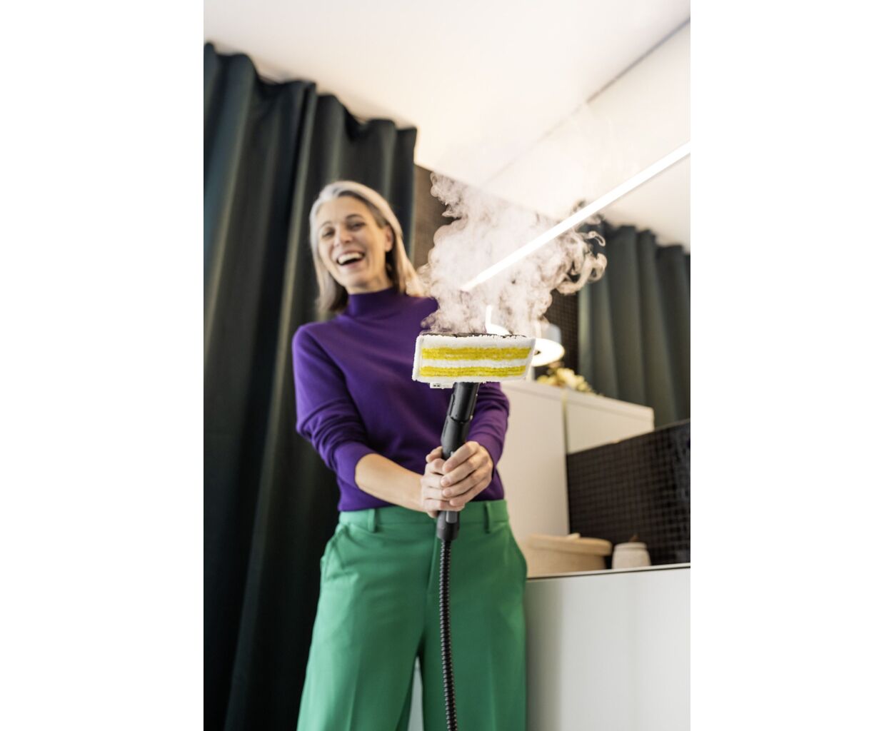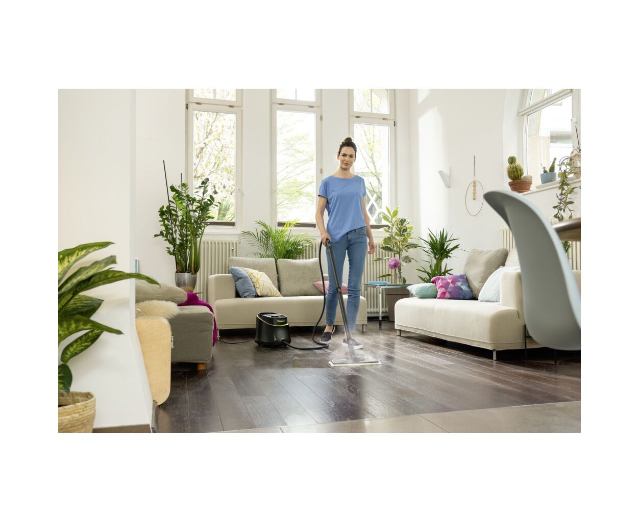Завдяки 2-ступеневому регулюванню подачі пари пристрій легко адаптується до різних типів поверхонь і ступеня їх забруднення. Вбудований картридж для захисту від накипу, бак для води, який можна наповнювати без перерв у роботі, зручний відсік для аксесуарів, кабелю та шланга, а також світлодіодний індикатор режимів забезпечують максимальну простоту та комфорт у використанні.