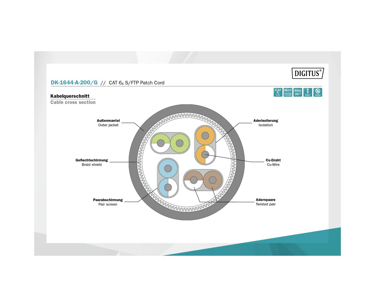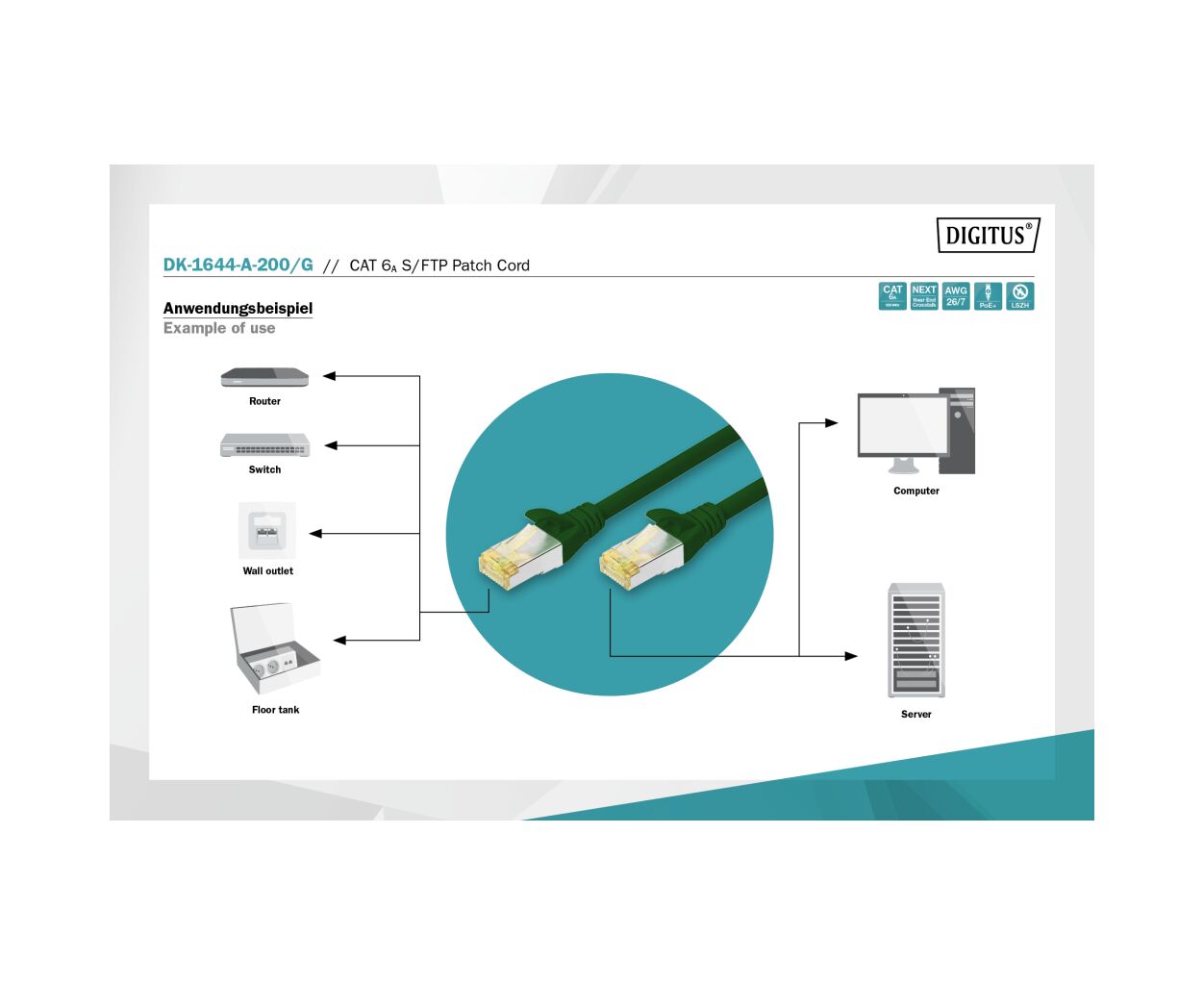 Опис Патч-корд 20м, CAT 6a S-FTP, AWG 26/7, Cu, LSZH, green Digitus (DK-1644-A-200/G)