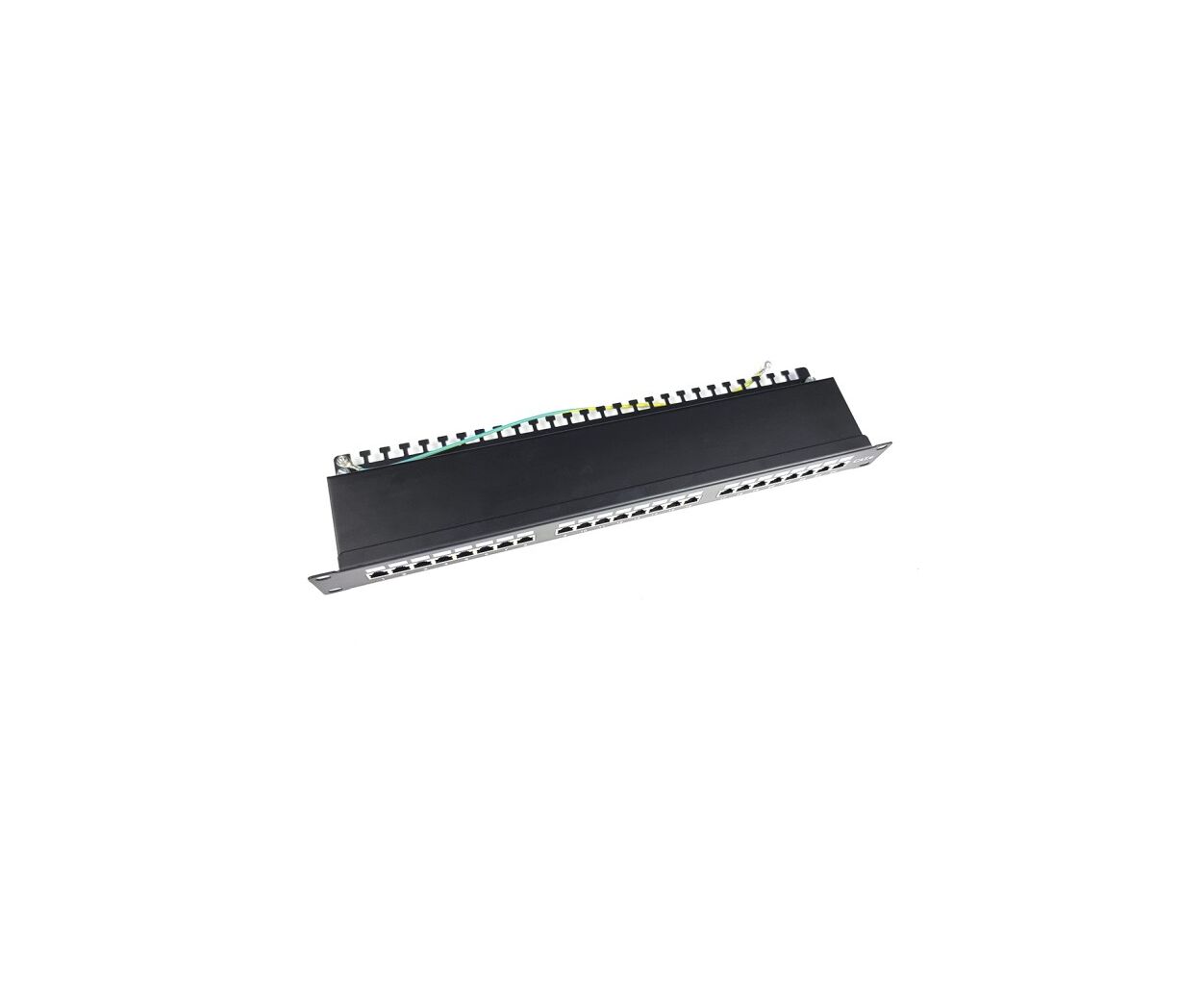 Патч-панель дозволяє виконати комутацію 24-х пристроїв. Вона оснащена фіксованими портами під конектори типу RJ-45. Модель належить до шостої категорії, тому здатна забезпечити швидкість передачі даних на рівні 10 Гбіт/сек. Патч панель на 24 порти — екранована: всі порти оснащені металевими пластинами. Це забезпечує захист сигналу від радіочастотних перешкод.