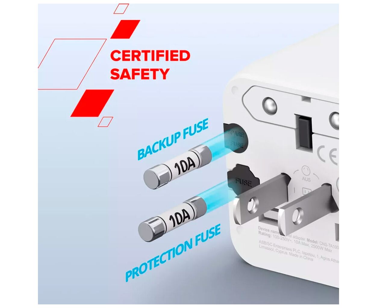 Створений для безпеки та продуктивності, OnTour One підтримує потужність до 2500 Вт та має подвійну розетку змінного струму. Пристрій також має універсальну передню розетку та окрему бічну розетку США / Японії. Використання повністю мідних внутрішніх компонентів забезпечує ефективну провідність, а вогнестійкий корпус з полікарбонату додає шар структурної міцності. Для захисту ваших пристроїв адаптер містить запобіжник на 10 А, що відповідає стандарту BS1362, та вбудовану систему запобіжного затвору із запасним запобіжником, що зберігається на борту, для додаткової впевненості. Кожна деталь відповідає потребам тих, хто часто подорожує та цінує надійні та добре спроектовані інструменти. OnTour One поєднує основні функції заряджання у вишуканому, готовому до подорожей вигляді: він створений для реального використання, куди б ви не пішли.
