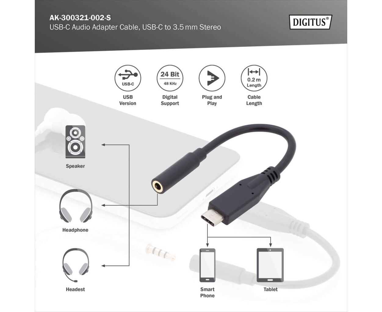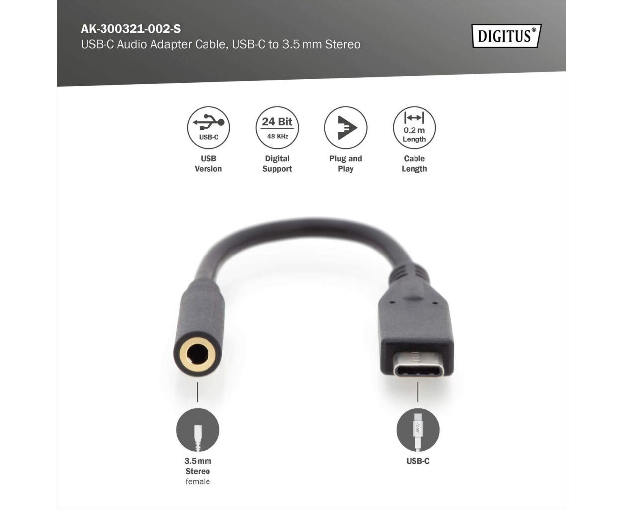 Опис Перехідник USB-C M to 3.5mm F 0.2m Digitus (AK-300321-002-S)