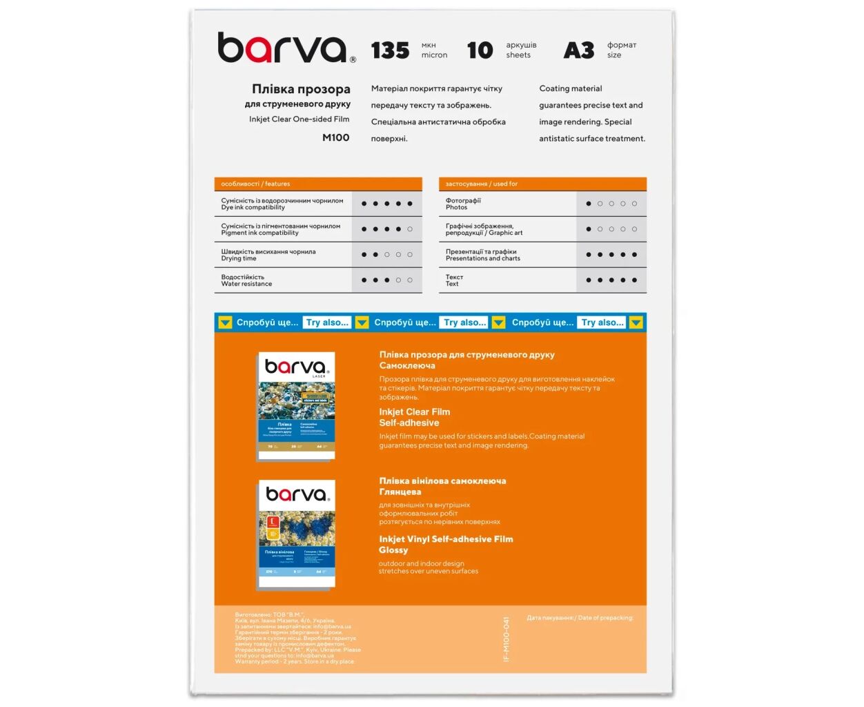 Опис Плівка для друку Barva А3 10ст 135 мкм, polyester, for ink, transparent (IF-M100-041)