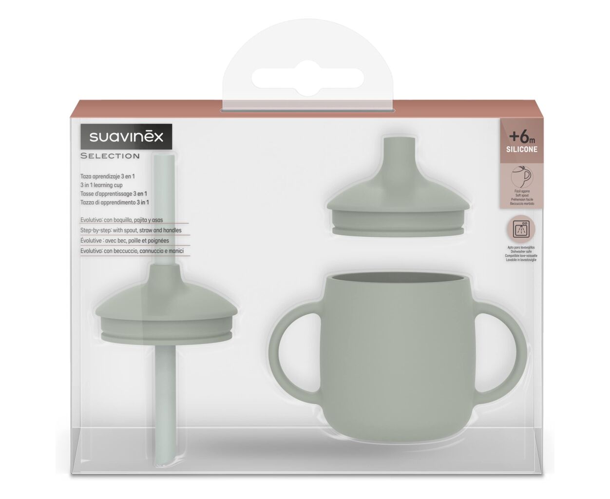 Опис Поїльник-непроливайка Suavinex Colour Essence силіконова 3 в 1 (з носиком та трубочкою), 270 мл, +6 м , зелена (402899)