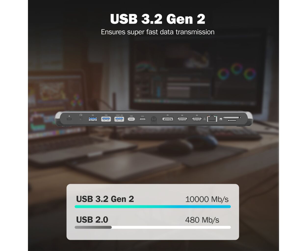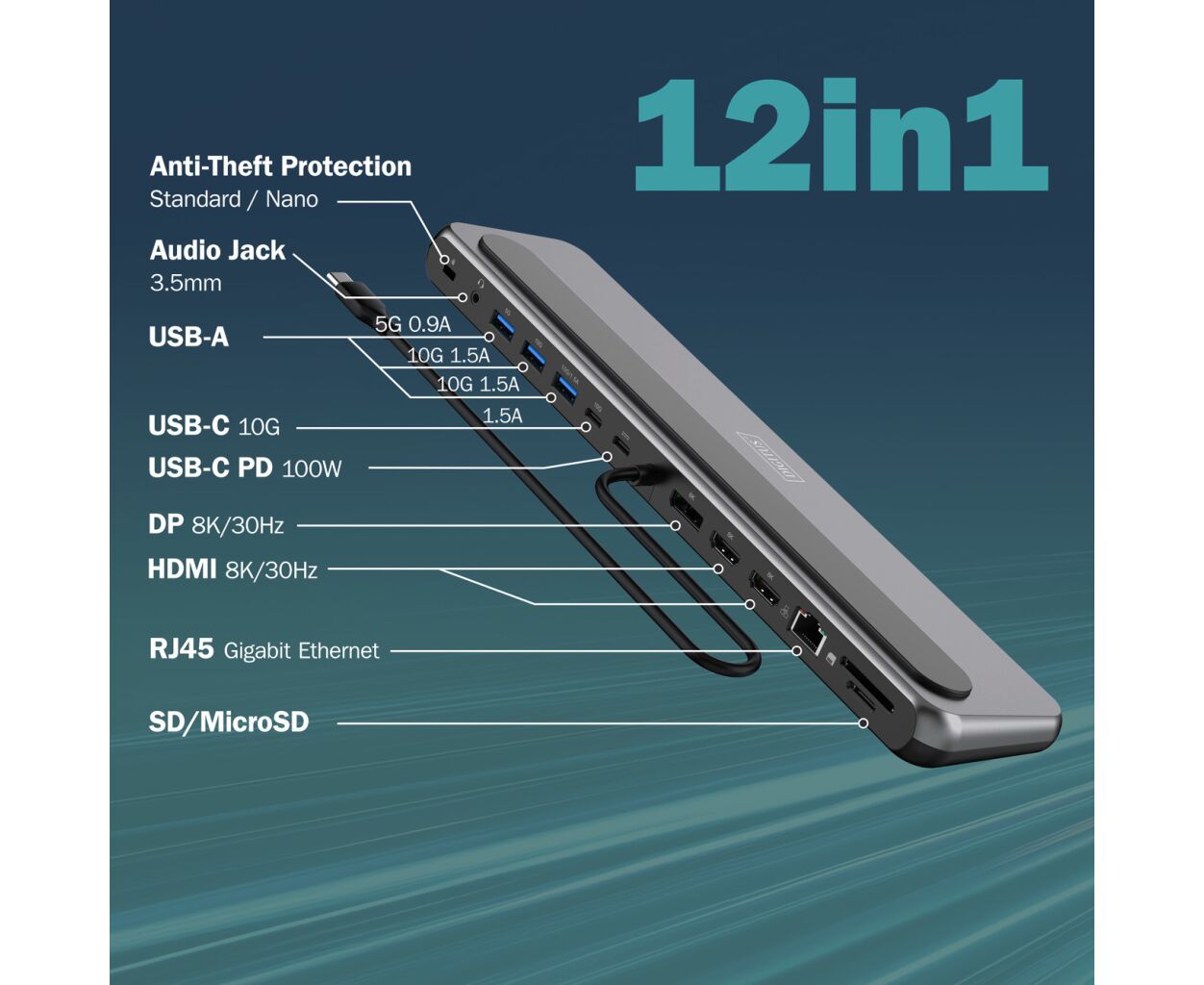 USB-C > 2xHDMI/1xDP/3xUSB-A/USB-C/RJ54/PD/Audio