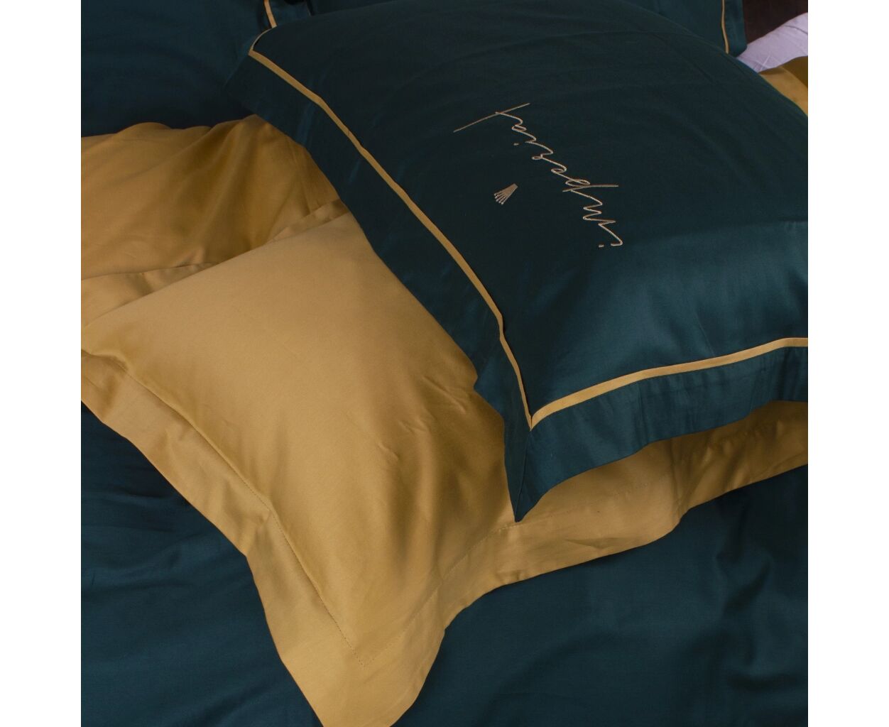 King Size, Простирадло - 220 x 240 см, Підковдра - 220 х 240 см, Наволочка - 50 х 70 см, сатин, 1 шт., 2 шт., однотонні моделі, упаковка: фірмова коробка + фірмовий пакет, на блискавці, смарагдово-золотистий
