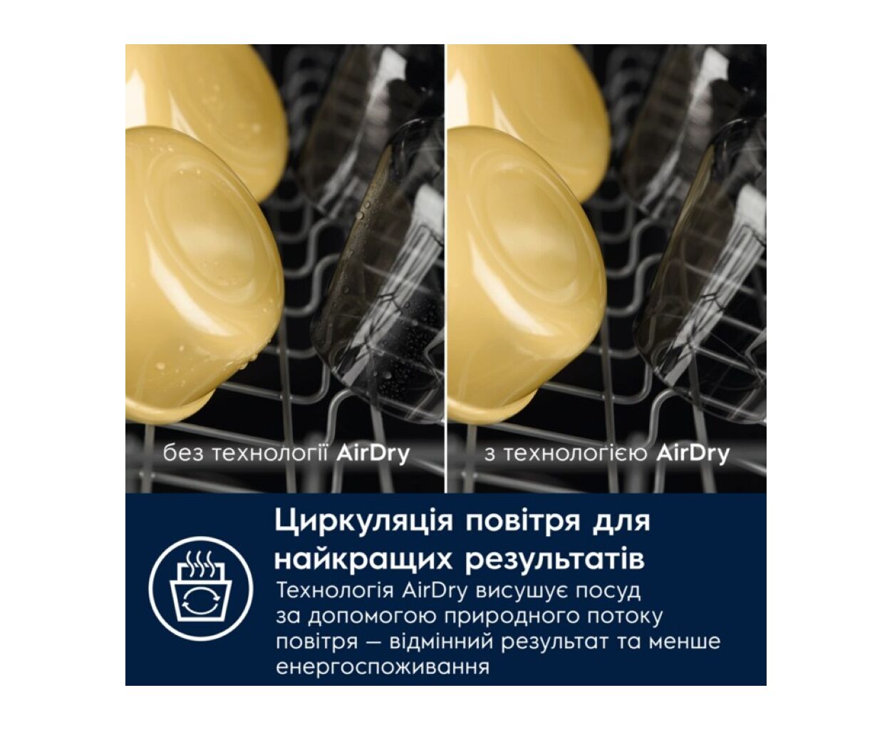 Технологія AirDry використовує природний потік повітря для сушіння наприкінці циклу, забезпечуючи до трьох разів вищу ефективність порівняно з системами із закритими дверцятами. Дверцята відчиняються на 10 см наприкінці циклу, забезпечуючи циркуляцію повітря для неперевершених результатів сушіння.