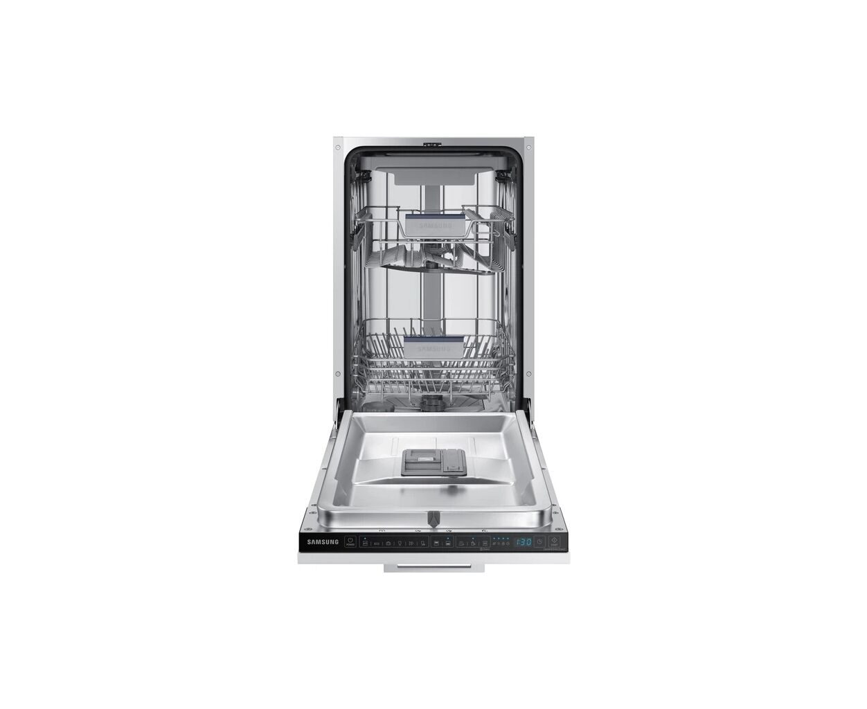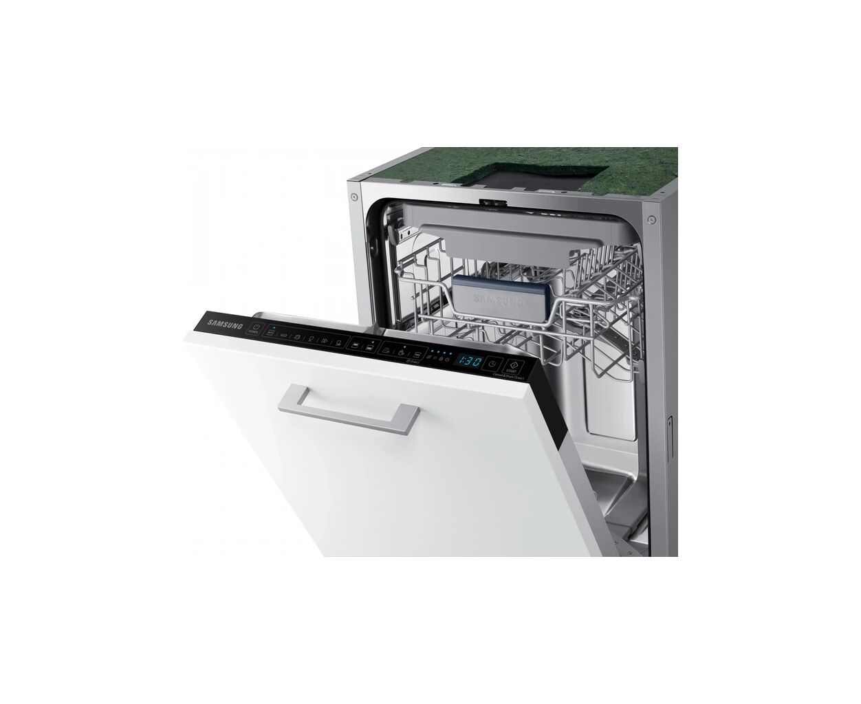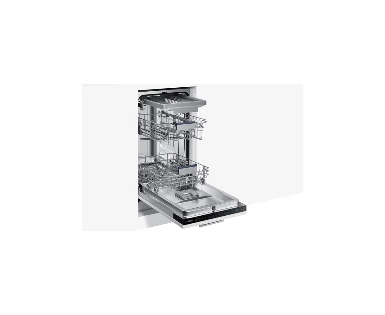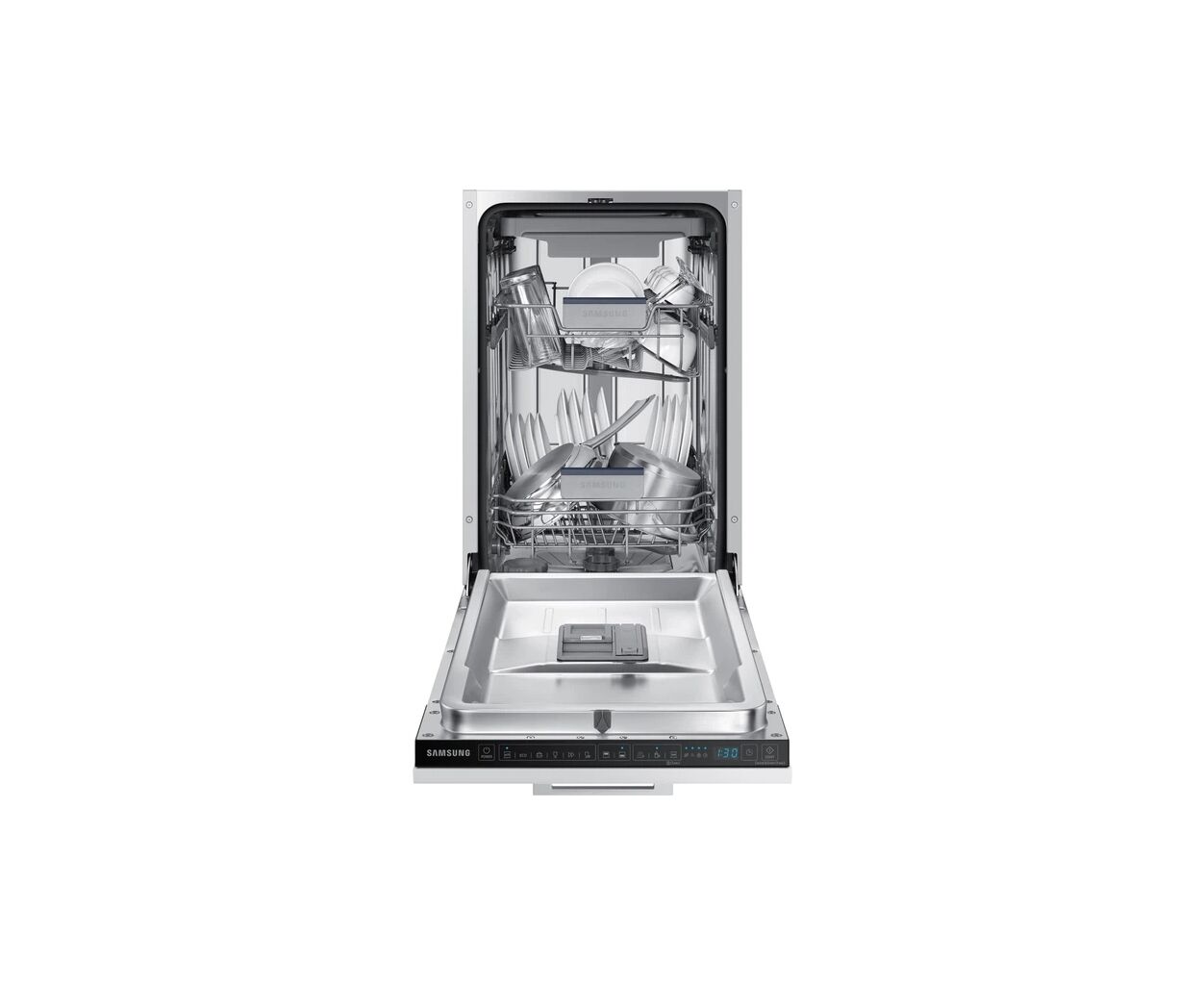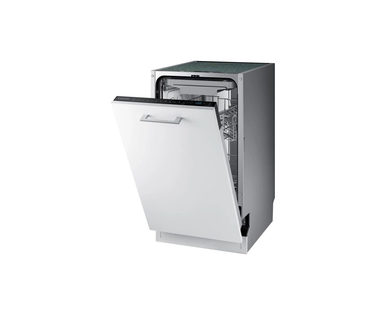 Вбудована посудомийна машина Samsung DW50R4070BB/UA — вузька модель шириною 45 см, яка поєднує компактність із високою ефективністю миття. Вона вміщує до 10 комплектів посуду та працює тихо — рівень шуму 44 дБ, що забезпечує комфорт під час роботи.