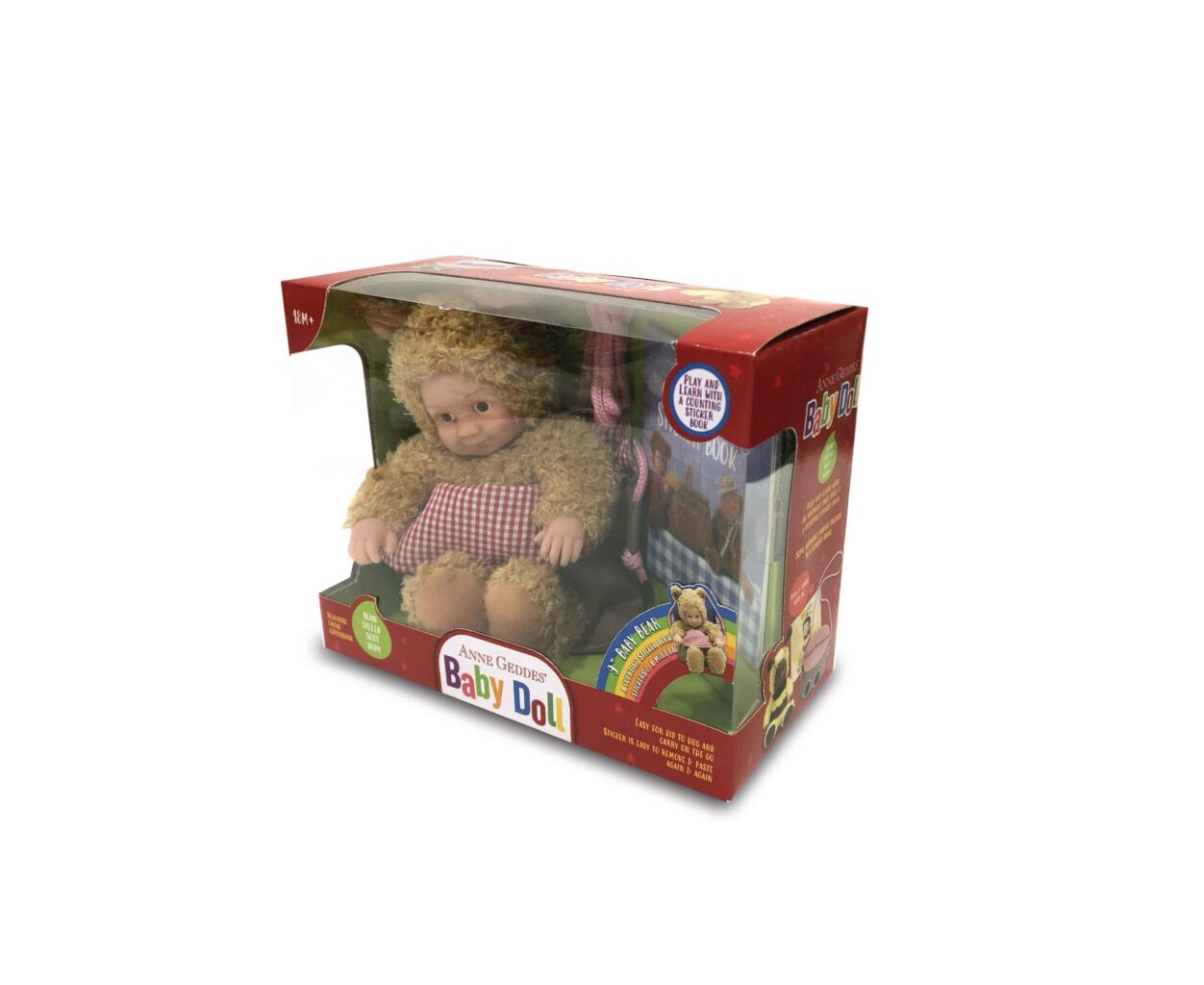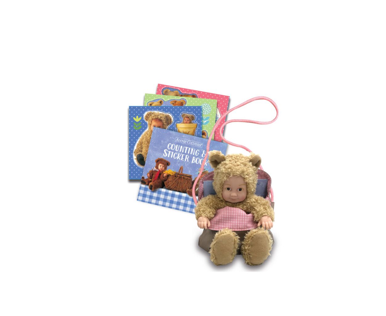 Anne Geddes Лялька “Маленьке Ведмежатко” з сумкою та стікерами – маленький друг для великих пригод!