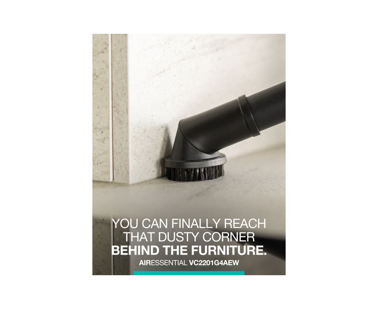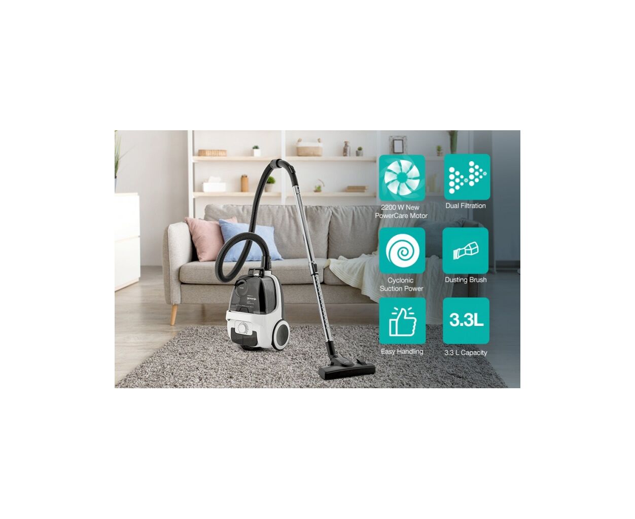 Пилосос AIRESSENTIAL потужністю двигуна 2200 Вт забезпечує ефективне сухе прибирання. Сила всмоктування 330 Вт і потік повітря 33,3 л/сек дозволяють швидко збирати пил і дрібне сміття. Пластиковий контейнер 3,3 л і телескопічна металева трубка роблять прилад зручним у використанні. Три гумові колеса та захисний бампер оберігають меблі та забезпечують легке пересування.