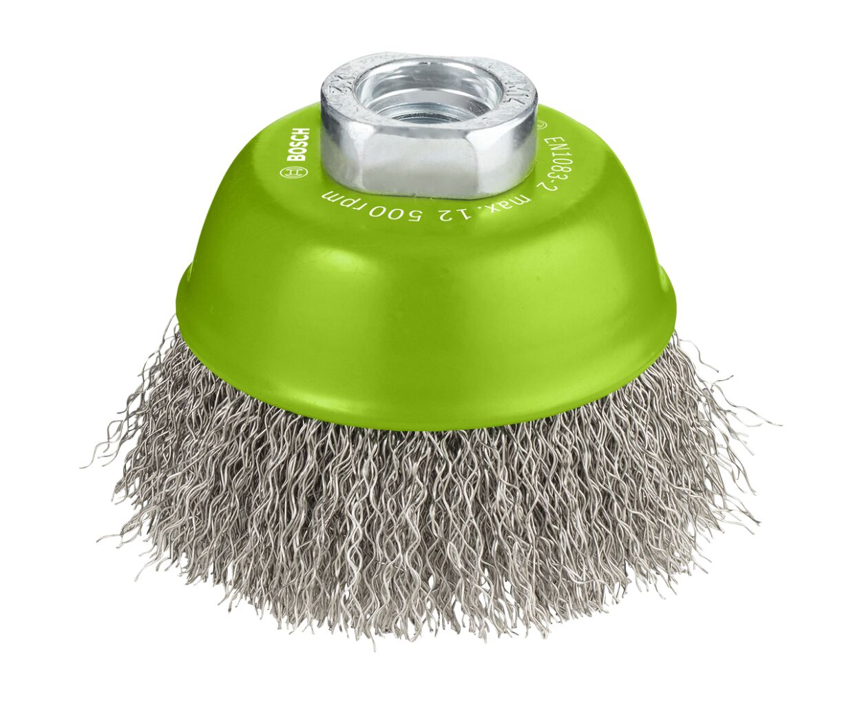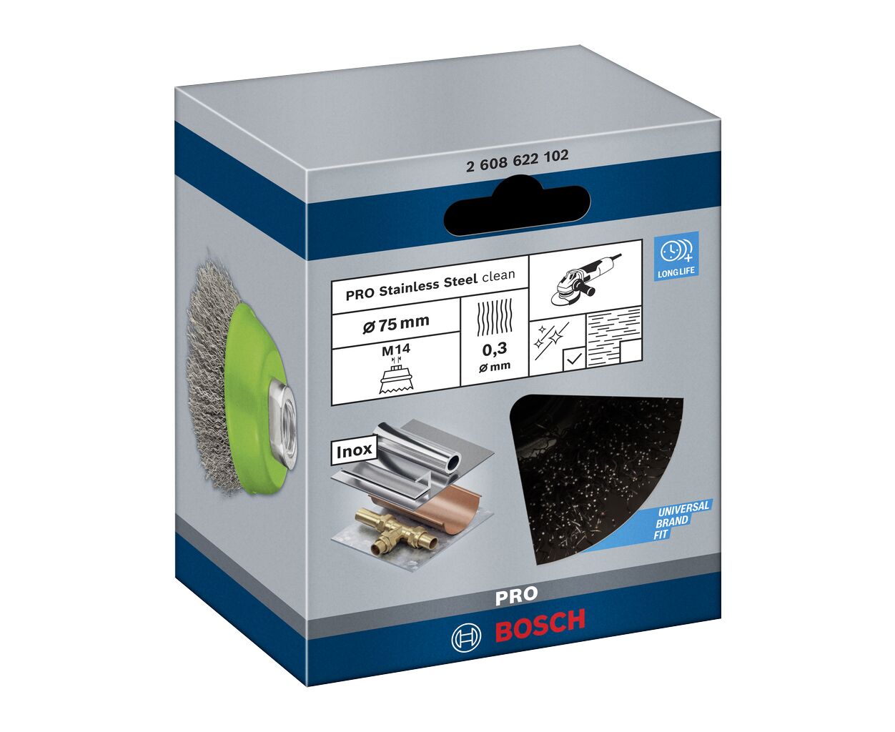 Опис Щітка для електроінструменту Bosch Professional чашкова, нержавіюча 75мм, 0.3мм, M14 (2.608.622.102)