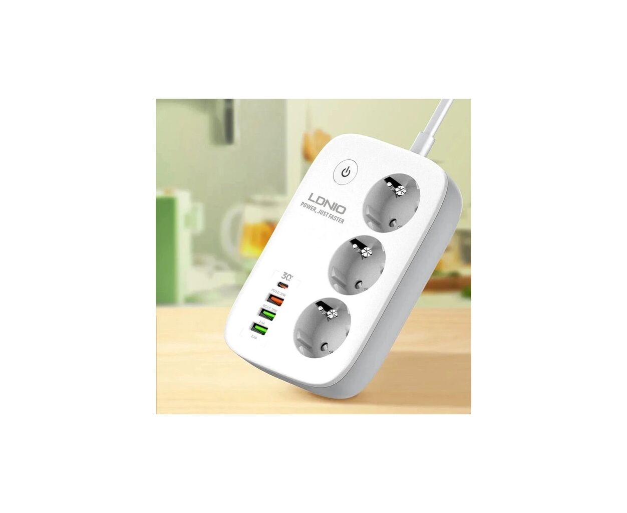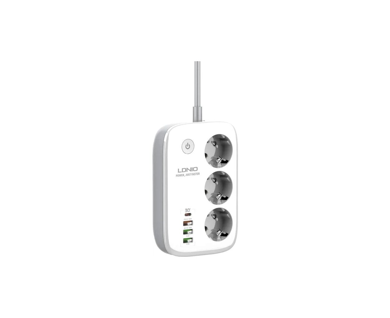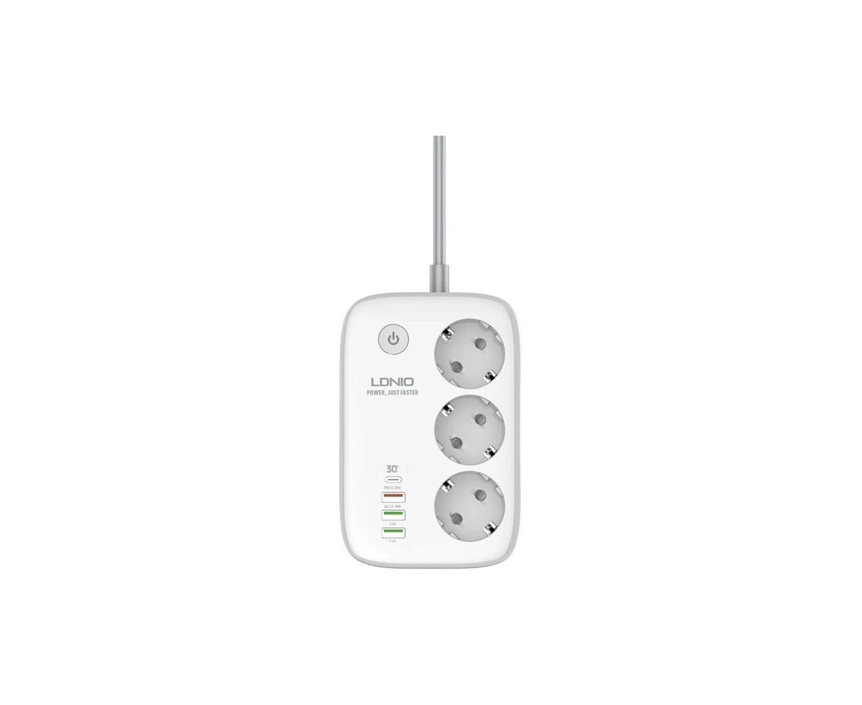 LDNIO SEW3452 – мережевий фільтр, оснащений 3 розетками, 3 USB-роз'ємами, роз'ємом Type-C та перемикачем. Роз'єм Type-C підтримує швидку зарядку протоколу PD з максимальною потужністю на виході 30Вт, а маркований червоним кольором USB порт - технологію QC з максимальною потужністю 18Вт. Сила струму на виході двох USB портів може досягати 2.4А. Загальна потужність на виході всіх 4 роз'ємів – 30Вт, на виході розеток – 2500Вт. Подовжувач обладнаний захистом від короткого замикання, перевантаження, перенапруги.