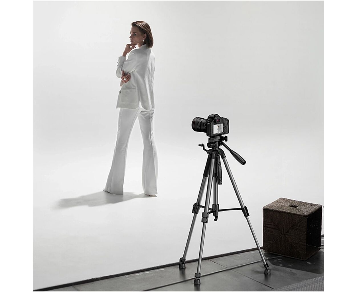 Довжина штатива для камери складає всього 53.5 см, а вага – 1.2 кг, що дозволяє легко подорожувати. Ручка спроектована так, що ви можете брати її будь-куди. В аксесуарі є сумка, яку зручно носити із собою.