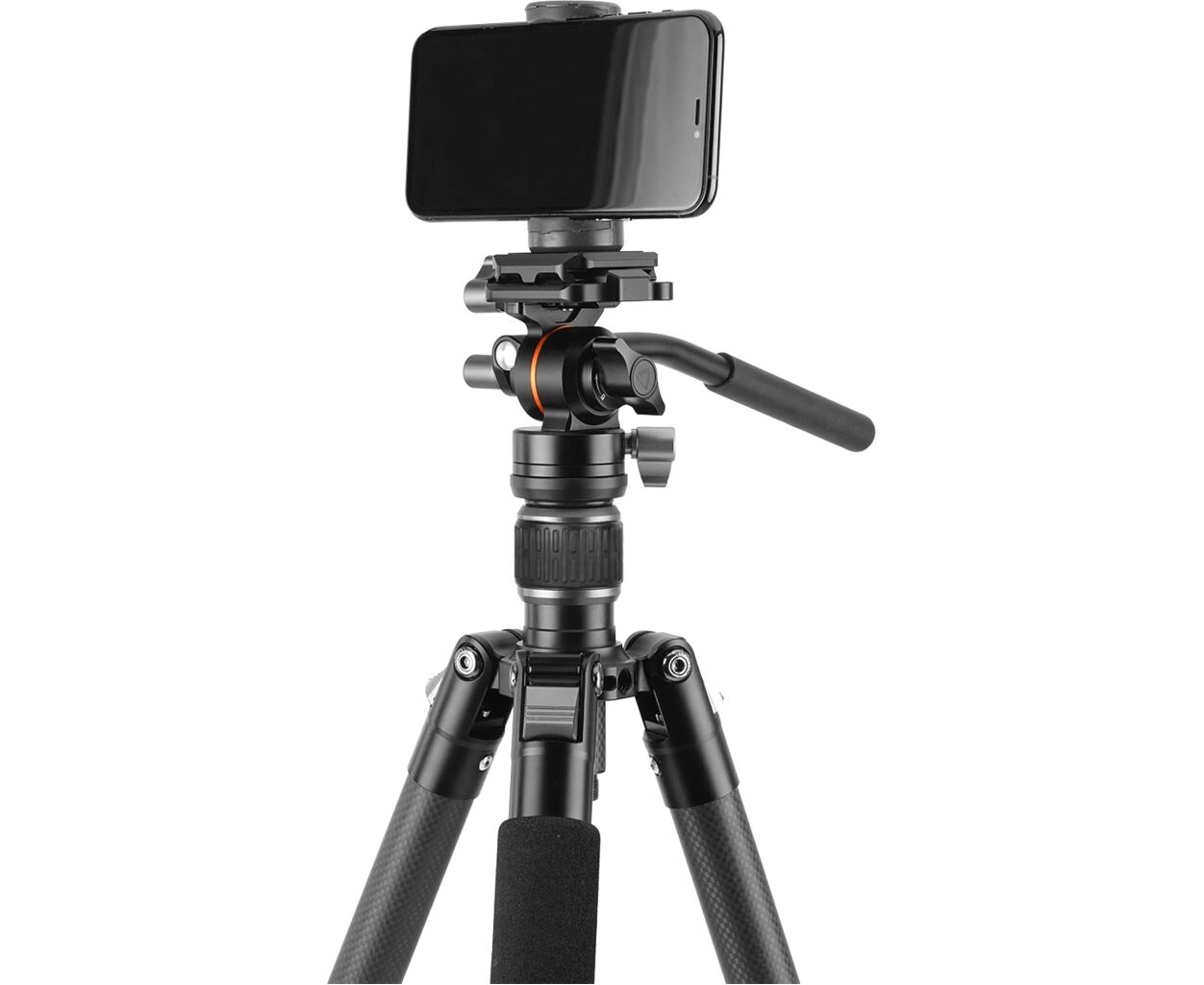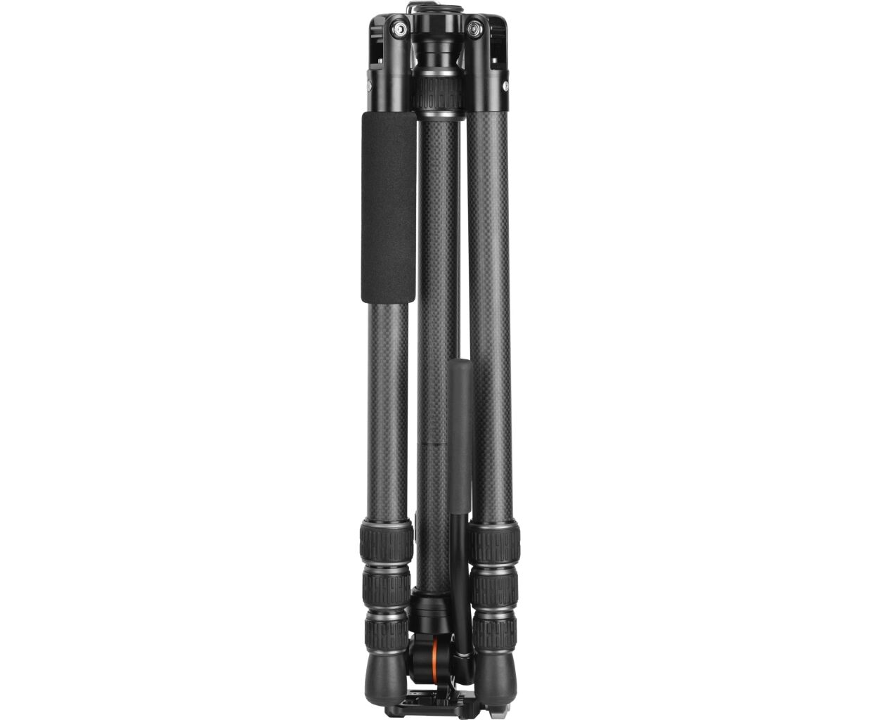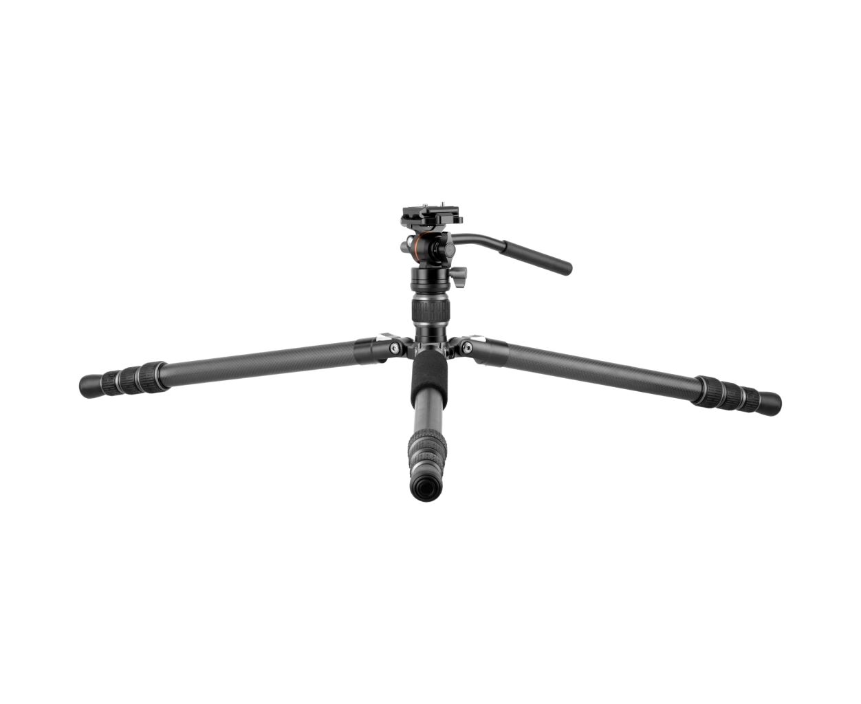 Ніжки штатива складаються з чотирьох секцій із міцного та легкого карбону, максимальний діаметр яких становить 26 мм — це забезпечує надійну підтримку навіть для важкої апаратури. Зручна система фіксації Flip Lock (кліпса) дозволяє швидко розкладати або складати трипод, не відволікаючись від процесу знімання. Кожна ніжка має три фіксовані кути нахилу — 20°, 50° та 80°, це дозволяє стабільно встановлювати штатив навіть на нерівній поверхні або знімати з низьких ракурсів. Центральна колона обладнана вбудованим адаптером для низьких кутів, даючи змогу опускати камеру практично до землі. Для покращення стійкості під час знімання на відкритому повітрі передбачено пружинний гачок для підвішування додаткового вантажу, а бульбашковий рівень допомагає точно вирівняти горизонт.