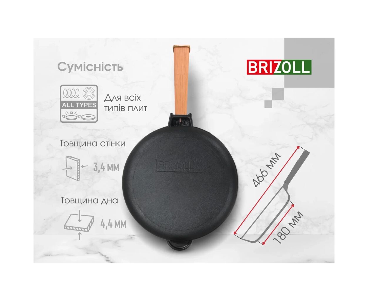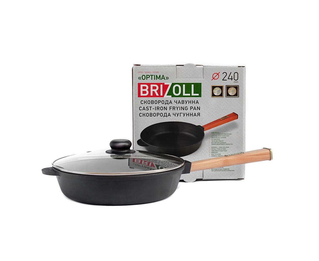 Опис Сковорода Brizoll Optima чавунна з ручкою та скляною кришкою 240х60 мм (O2460-P-C)