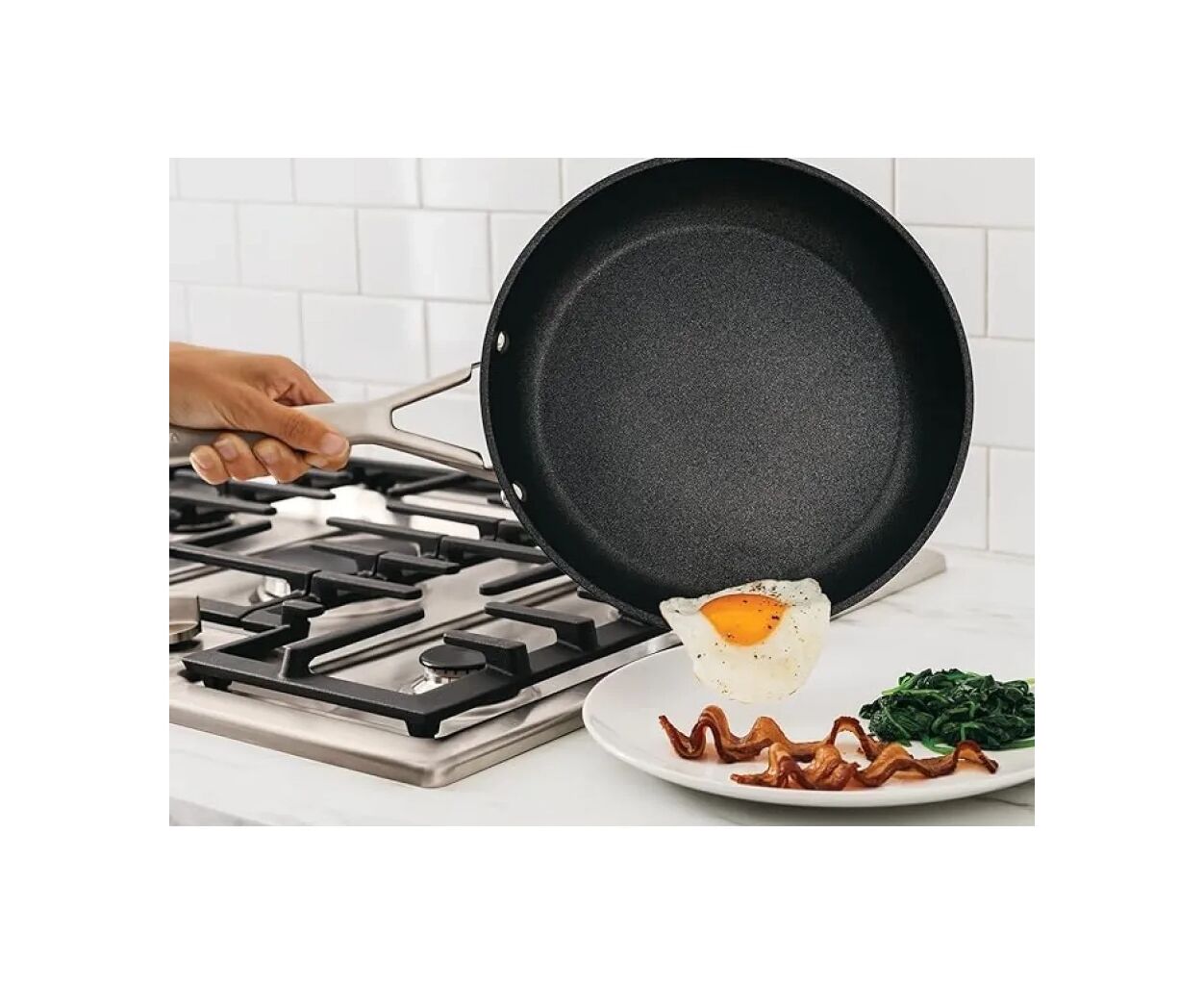 Сковорода створена для тривалої служби. Вона виготовлена з кованого алюмінію, має гладку зовнішню поверхню та зручні ручки з нержавіючої сталі. Покриття настільки міцне, що воно стійке до подряпин, придатне для миття у посудомийній машині і дозволяє використовувати металеві кухонні прибори. Крім того, воно не містить PFOA, свинцю та кадмію.
