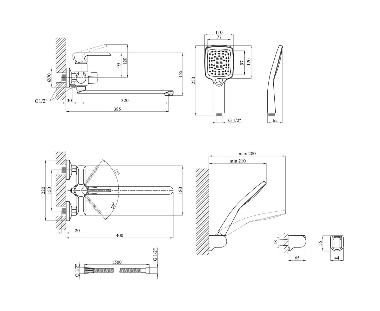 - душовий шланг у металевому обплетенні завдовжки 150 см, 1/2" "x 1/2"
