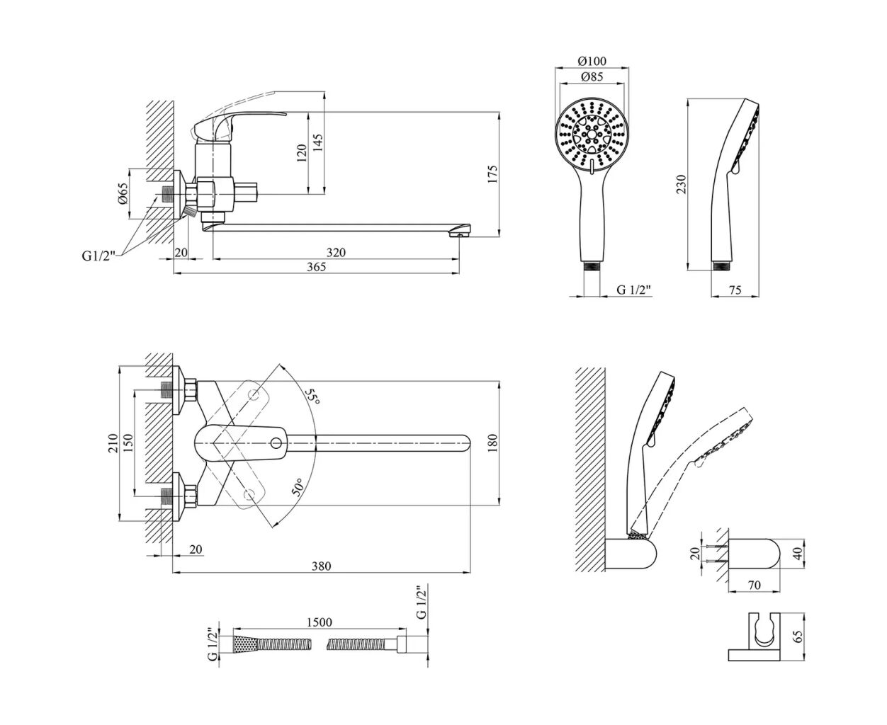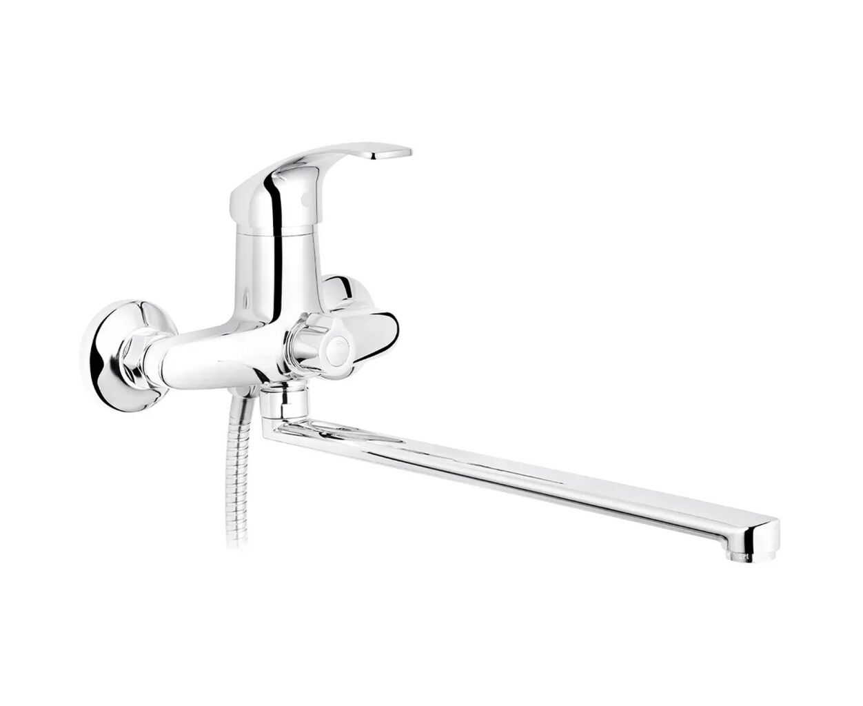 для ванни, одноважільний, настінний, латунь, поворотний, Довжина виливу - 32 см, Підключення - 1/2", Колір - сріблястий, Німеччина