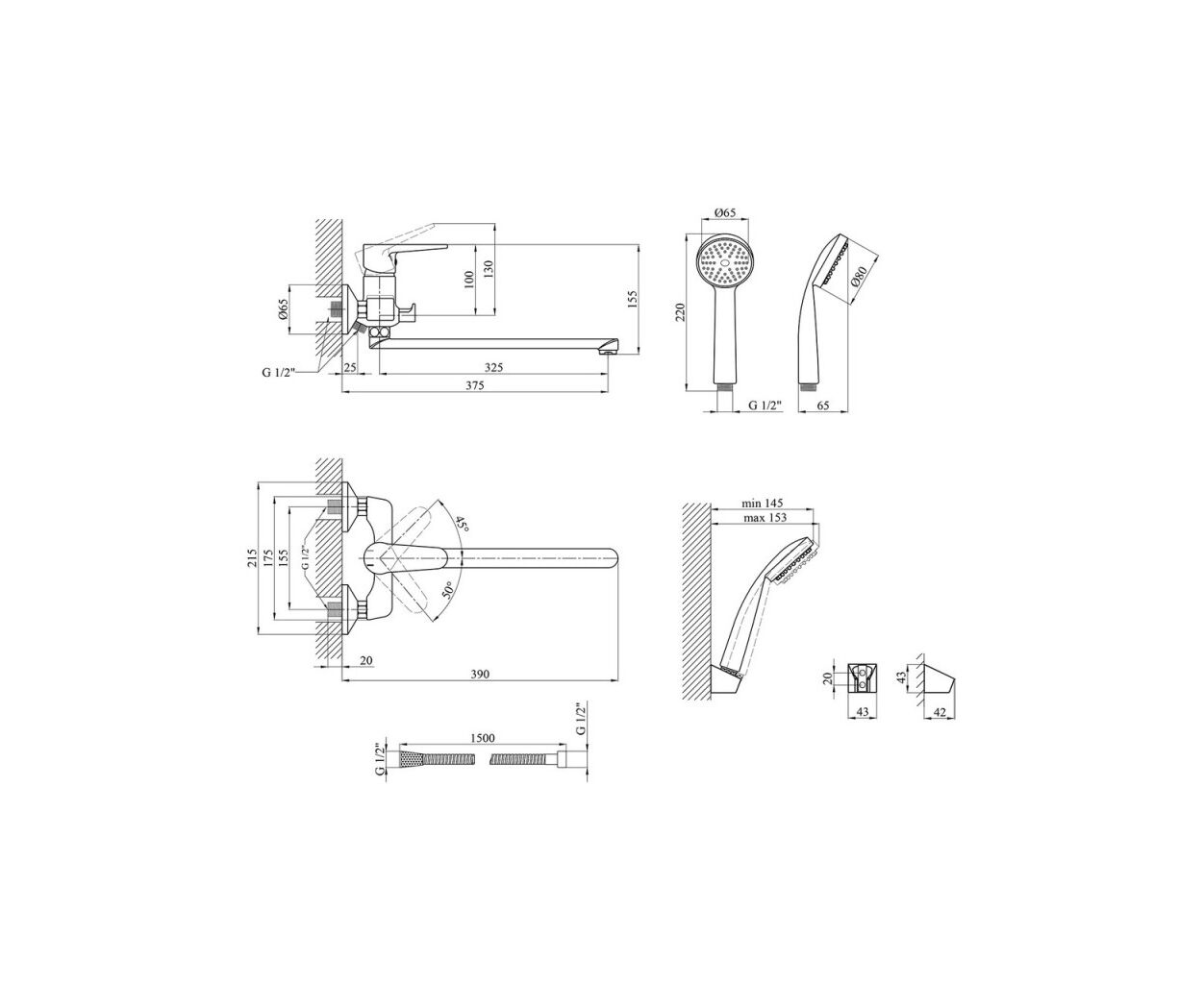 - душовий шланг у металевому обплетенні завдовжки 150 см, 1/2" "x 1/2"