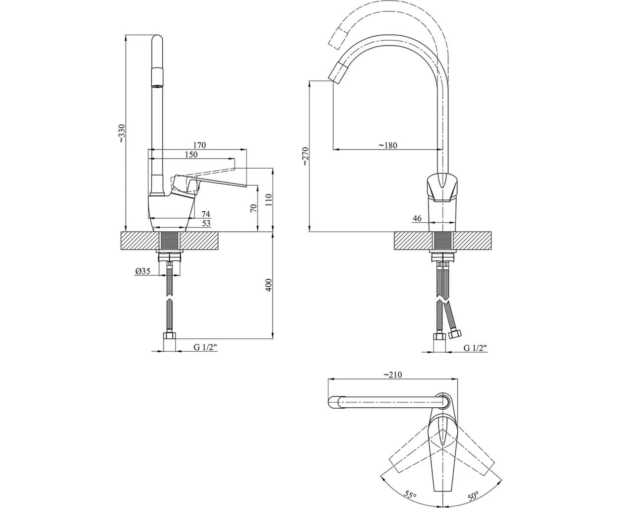одноважільний, врізний, силумін, поворотний, Довжина виливу - 23 см, Підключення - 1/2", Колір - чорний, Німеччина