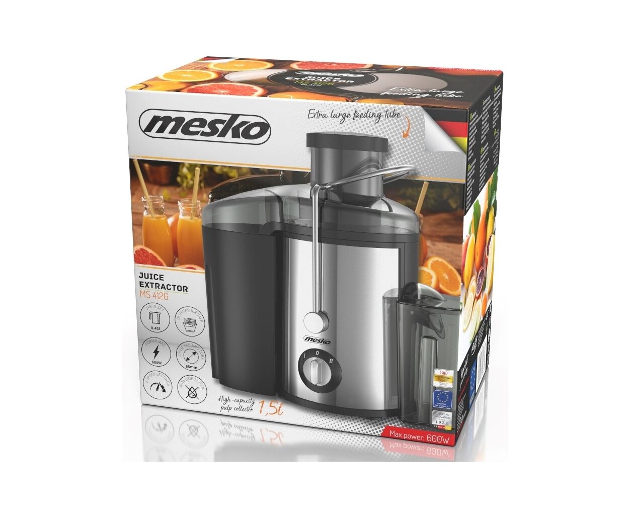 Соковижималка MESKO MS-4126 дає змогу дуже швидко приготувати велику кількість соку, що гарантується високою потужністю двигуна і глечиком для соку об'ємом 450 мл. Для додаткової зручності пластикові частини соковижималки можна мити в посудомийній машині.