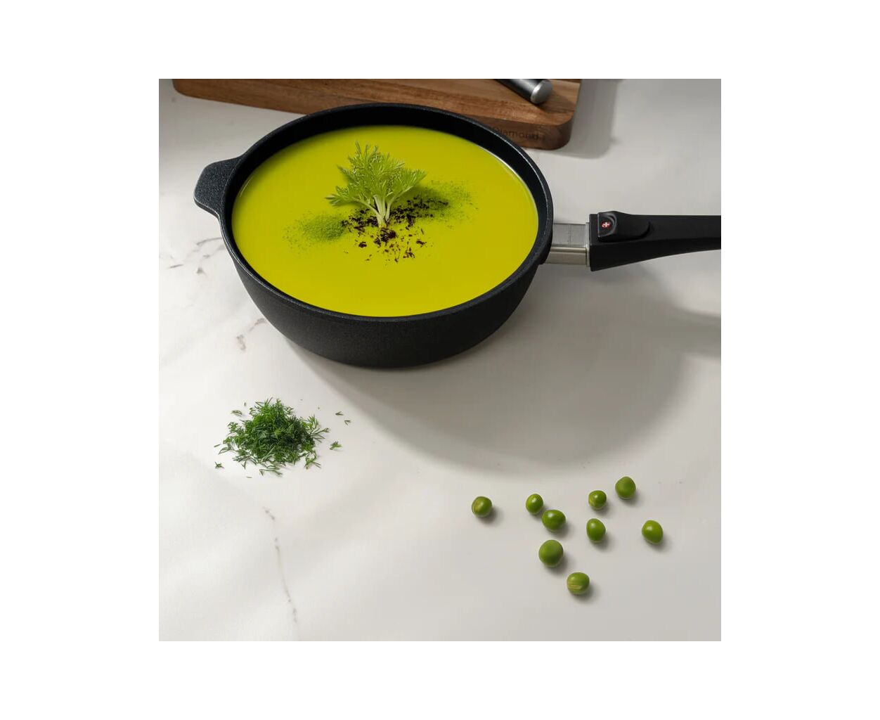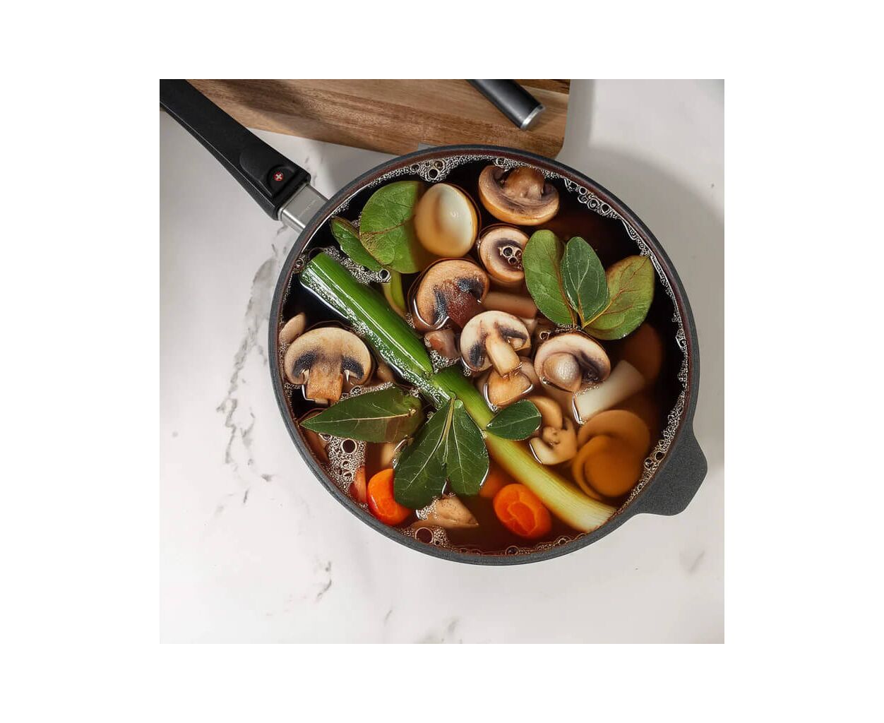 Однією з ключових особливостей цього сотейника є його антипригарне внутрішнє покриття, яке забезпечує легке приготування без прилипання їжі. Це дозволяє зменшити використання олії або жиру, що робить страви не тільки смачними, але й здоровішими. Крім того, антипригарне покриття значно полегшує процес очищення, що робить цей сотейник практичним вибором для щоденного використання.