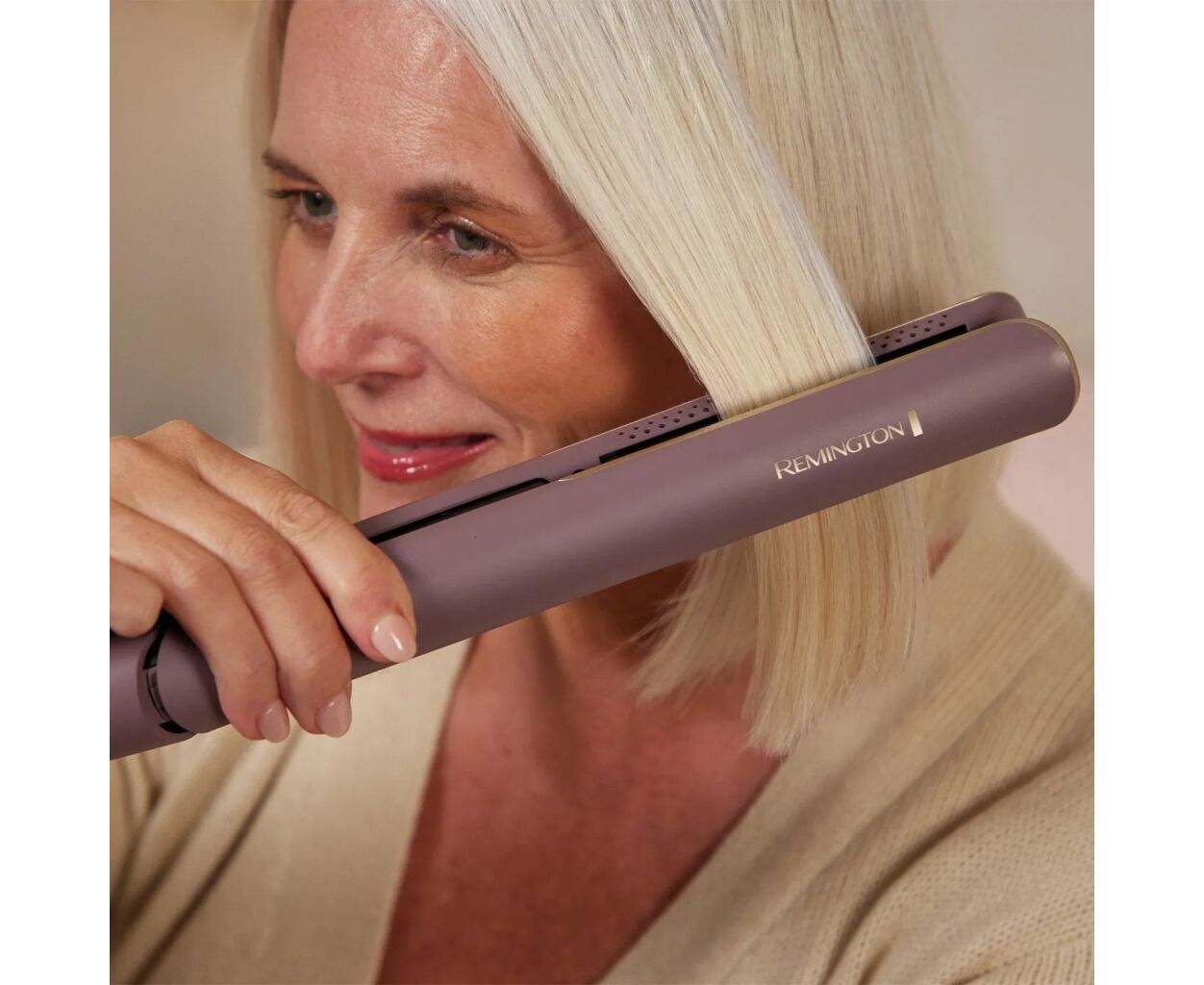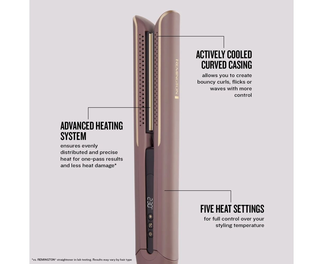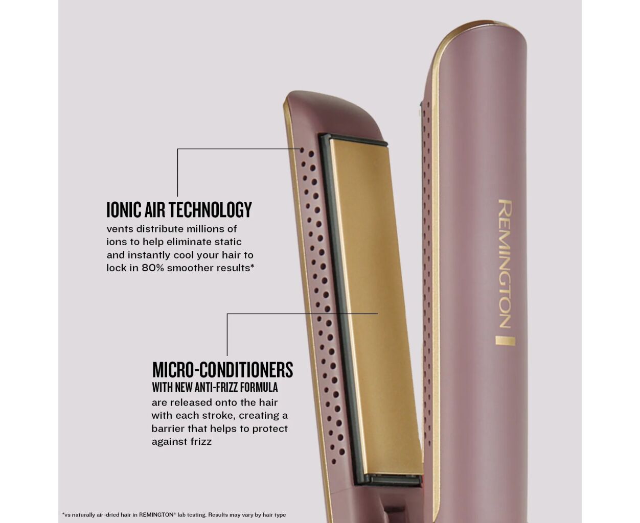 Випрямляч Remington AIRvive S8930 із потужністю 61 Вт і температурним діапазоном 150–230 °C створений для м’якого та ефективного укладання. Технологія Ionic Air усуває статичність і охолоджує волосся, забезпечуючи гладкість до 80 %. Керамічне покриття з мікрокондиціонерами захищає пасма від перегріву. Завдяки п’яти температурним режимам і нагріву за 15 с прилад підходить для будь-якого типу волосся.