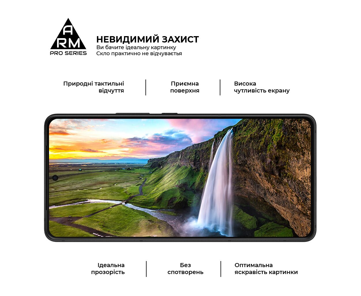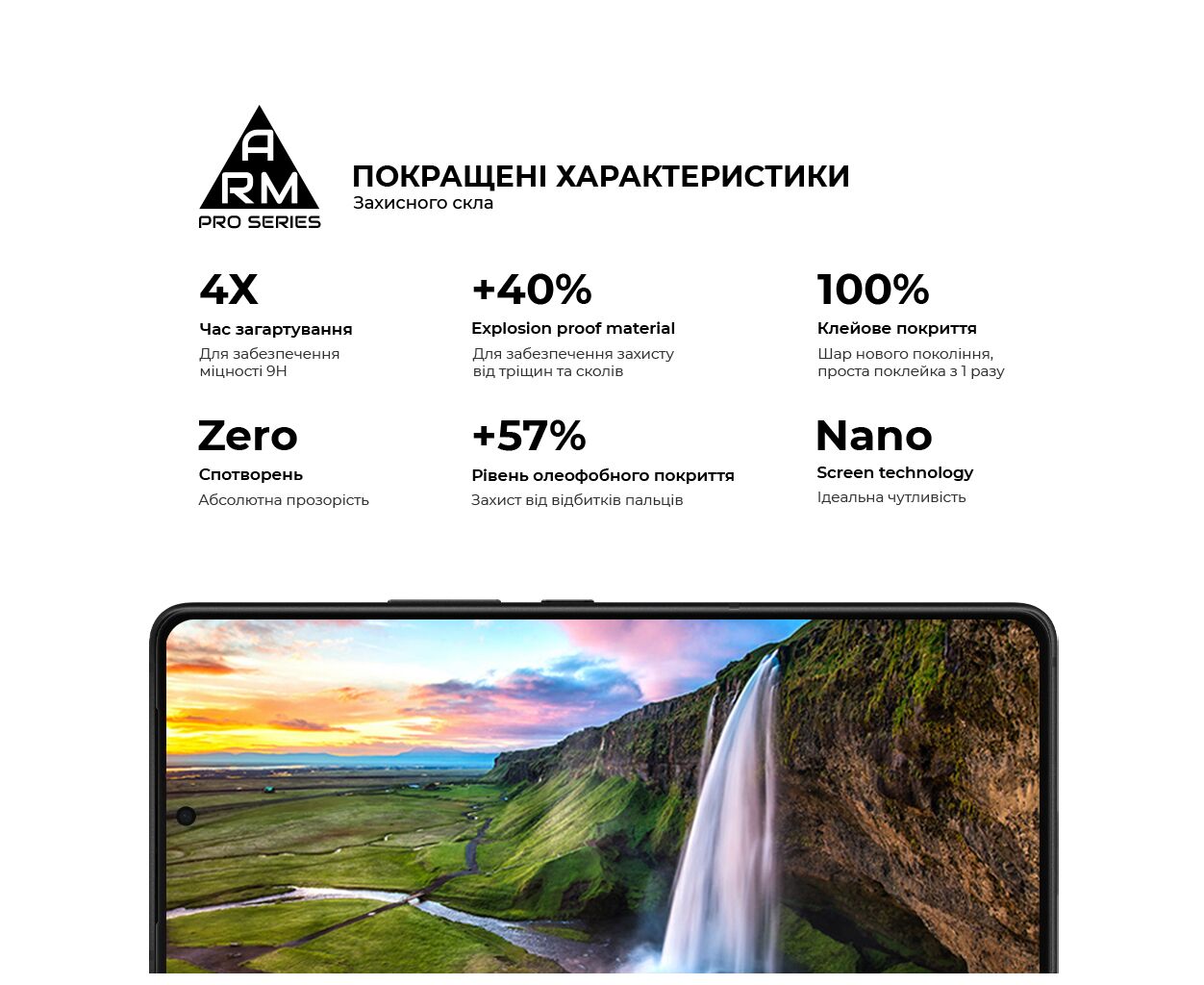 Верхня частина скла містить покращене олеофобне й гідрофобне покриття. Під час використання скла це забезпечує природні тактильні відчуття - пальці легко ковзають по поверхні. Водночас зображення відбивається з автентичною яскравістю й чіткістю без спотворень.