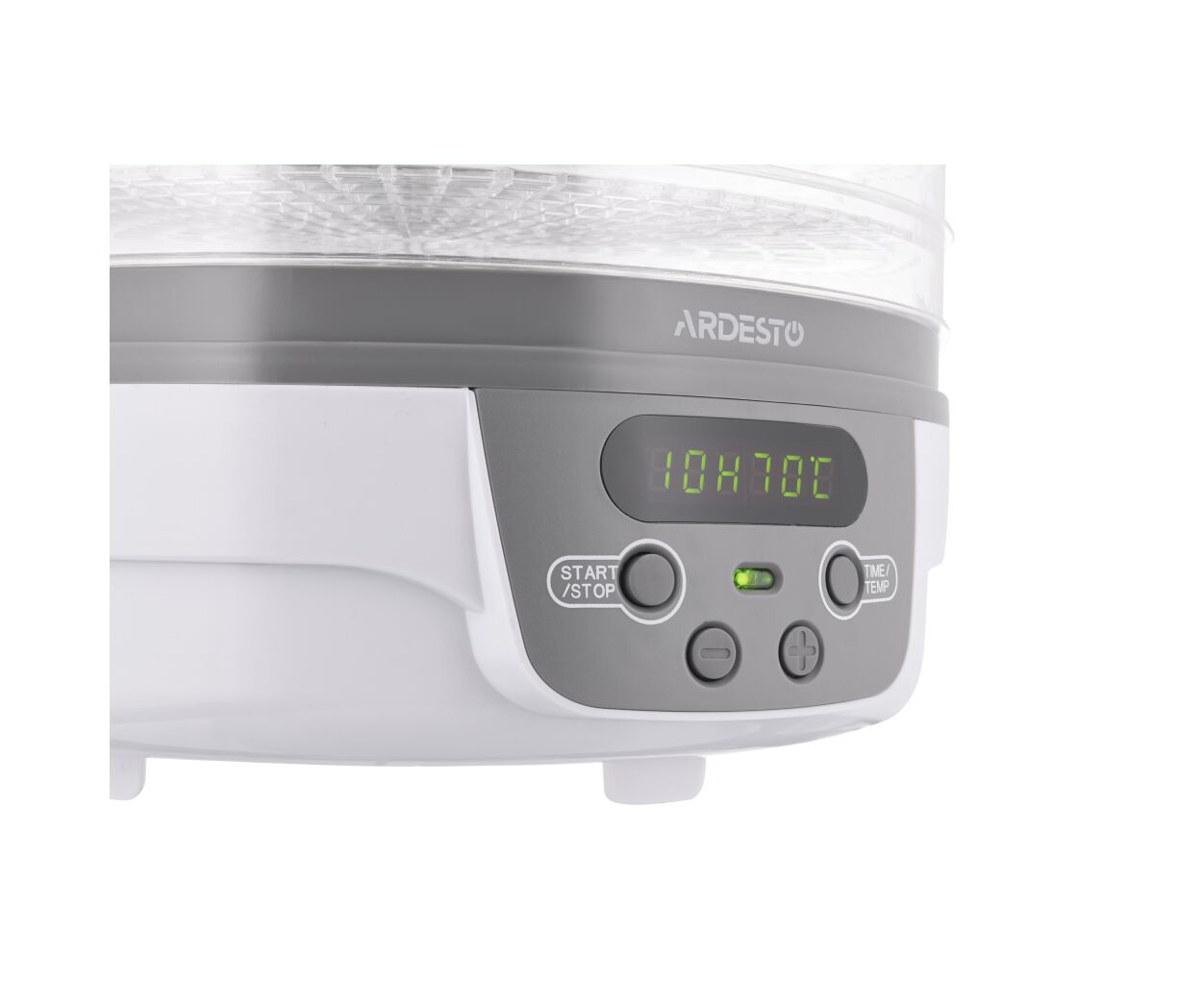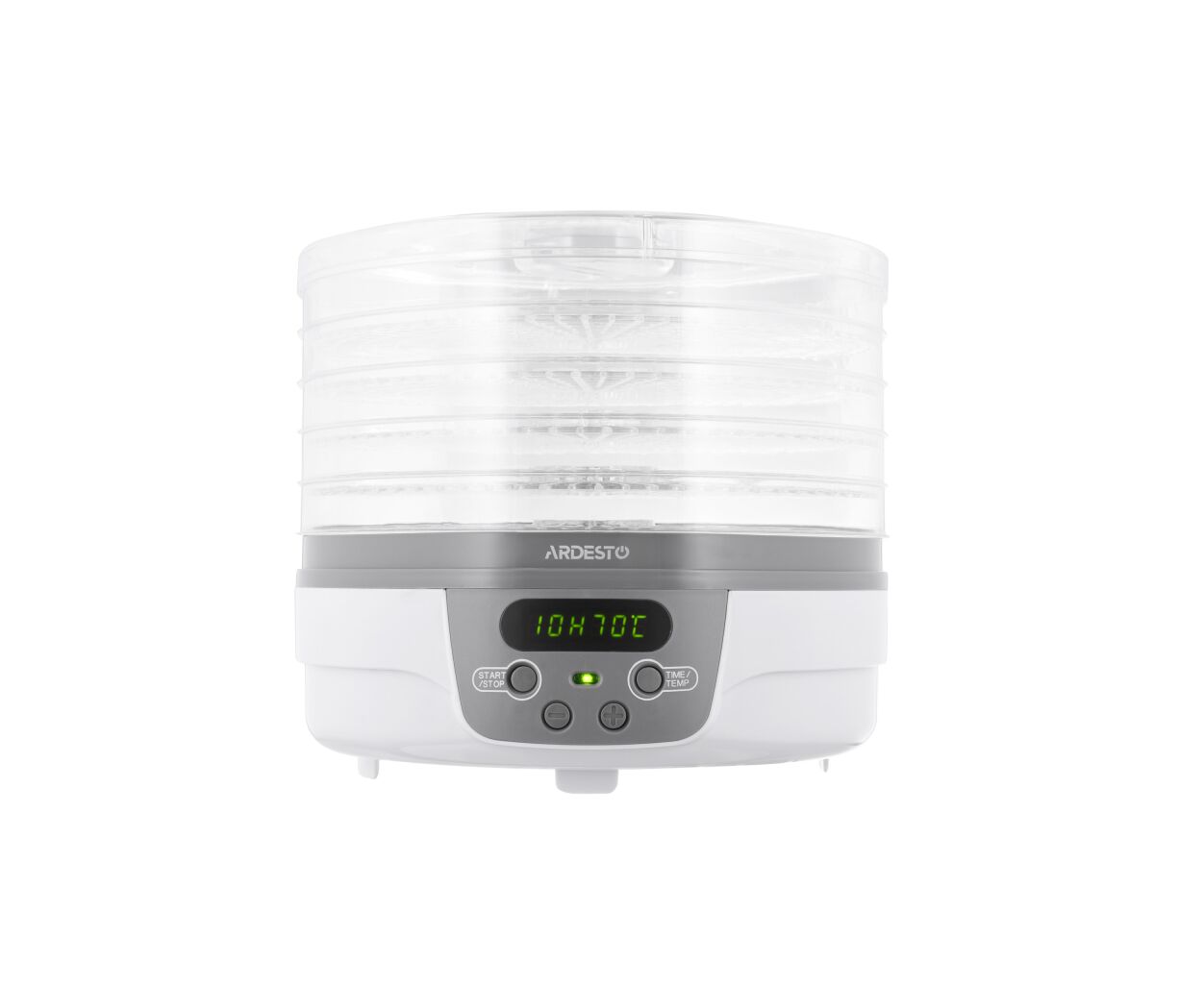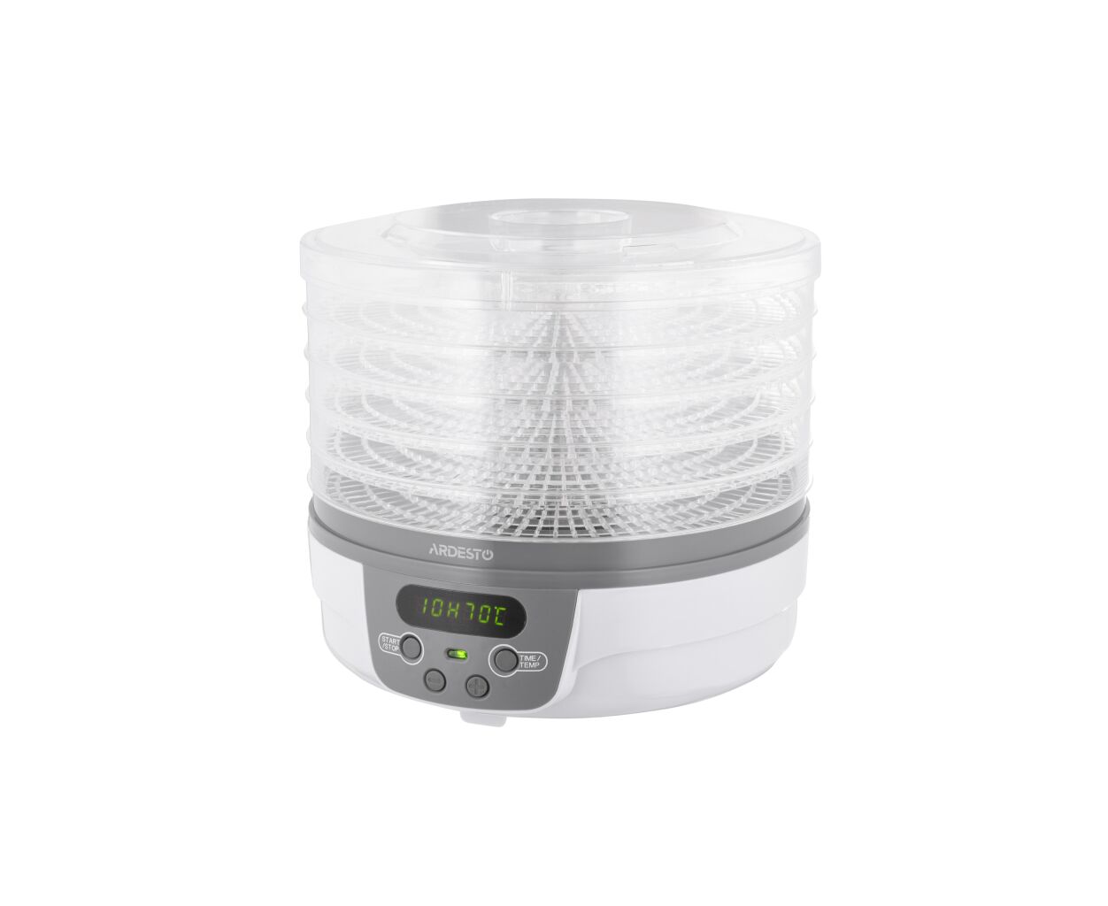 ARDESTO FDB-5321T білого кольору із сірою основою. Її кришка з отворами для повітря та п'ять піддонів діаметром 32 см та висотою 3 см – прозорі, що зручно для стеження за процесом сушіння. Температура сушіння регулюється від 40 до 70°С. Управління – електронне, потужність 250 Вт. На всіх рівнях продукти поступово висушуються із збереженням усіх мінералів та вітамінів. Наявність таймера від 1 до 48 год спрощує процес та економить час.