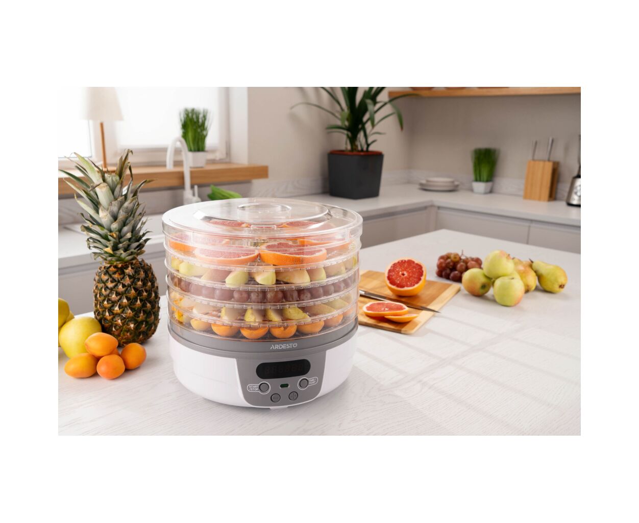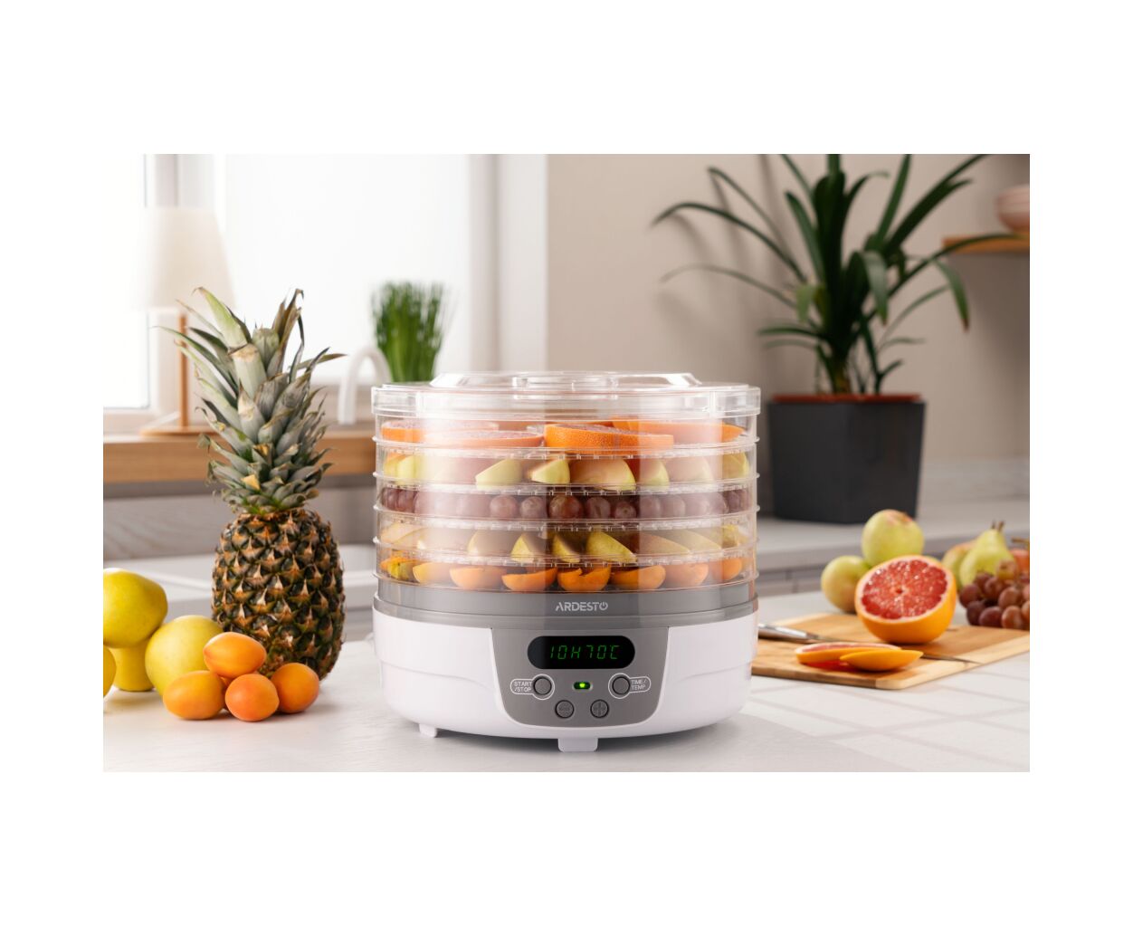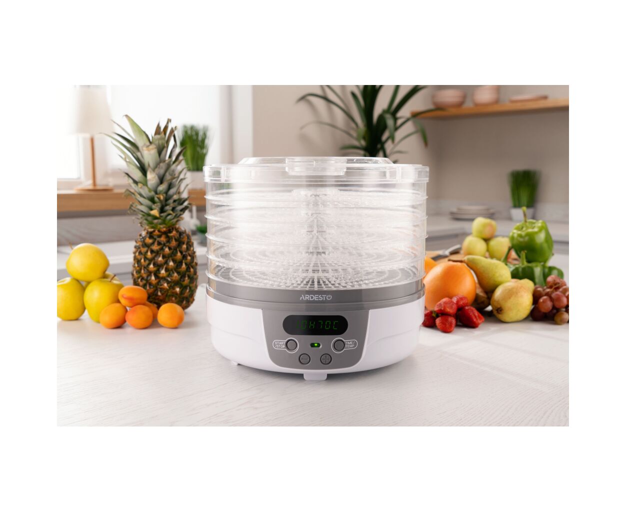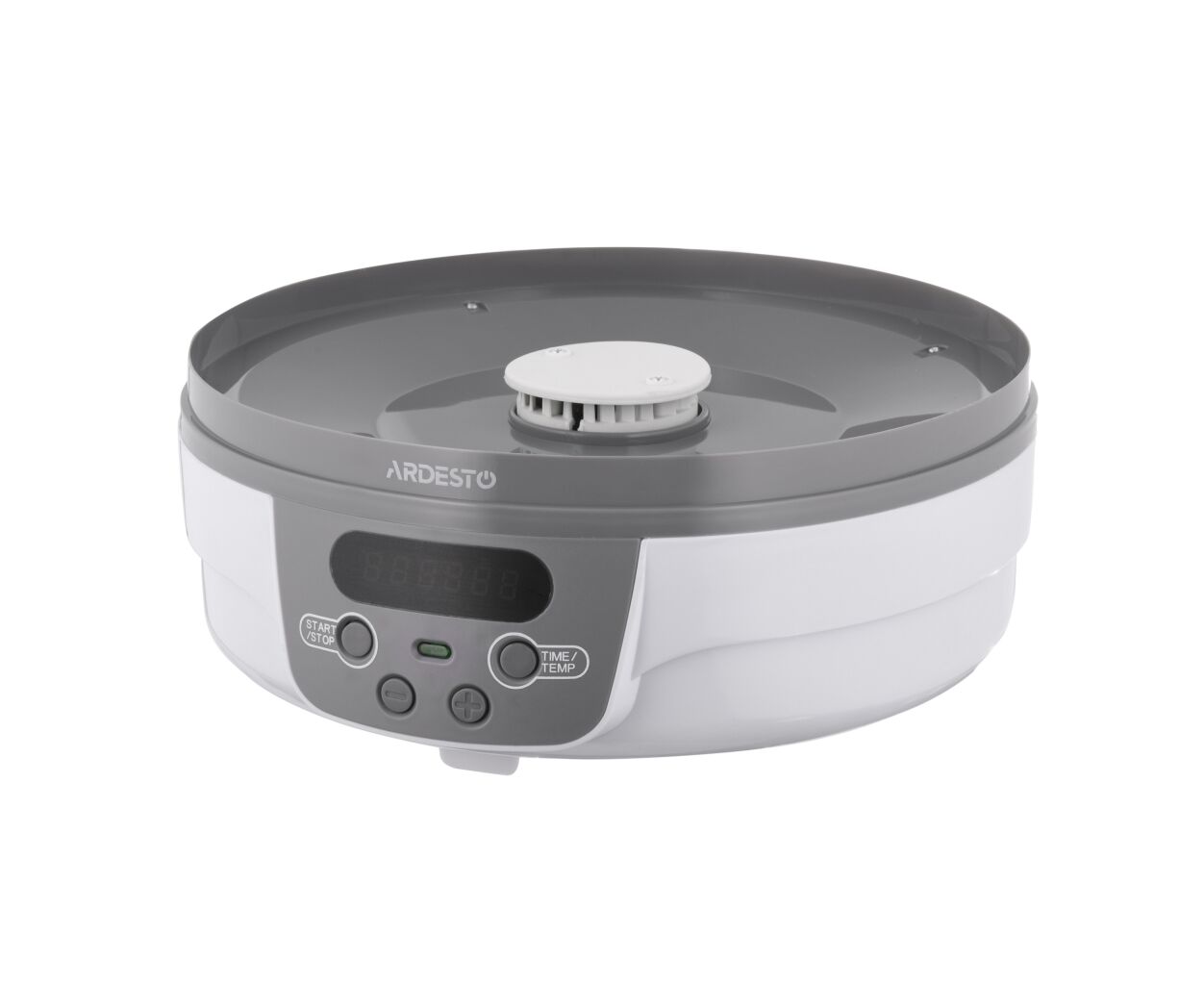 ARDESTO FDB-5321T білого кольору із сірою основою. Її кришка з отворами для повітря та п'ять піддонів діаметром 32 см та висотою 3 см – прозорі, що зручно для стеження за процесом сушіння. Температура сушіння регулюється від 40 до 70°С. Управління – електронне, потужність 250 Вт. На всіх рівнях продукти поступово висушуються із збереженням усіх мінералів та вітамінів. Наявність таймера від 1 до 48 год спрощує процес та економить час.