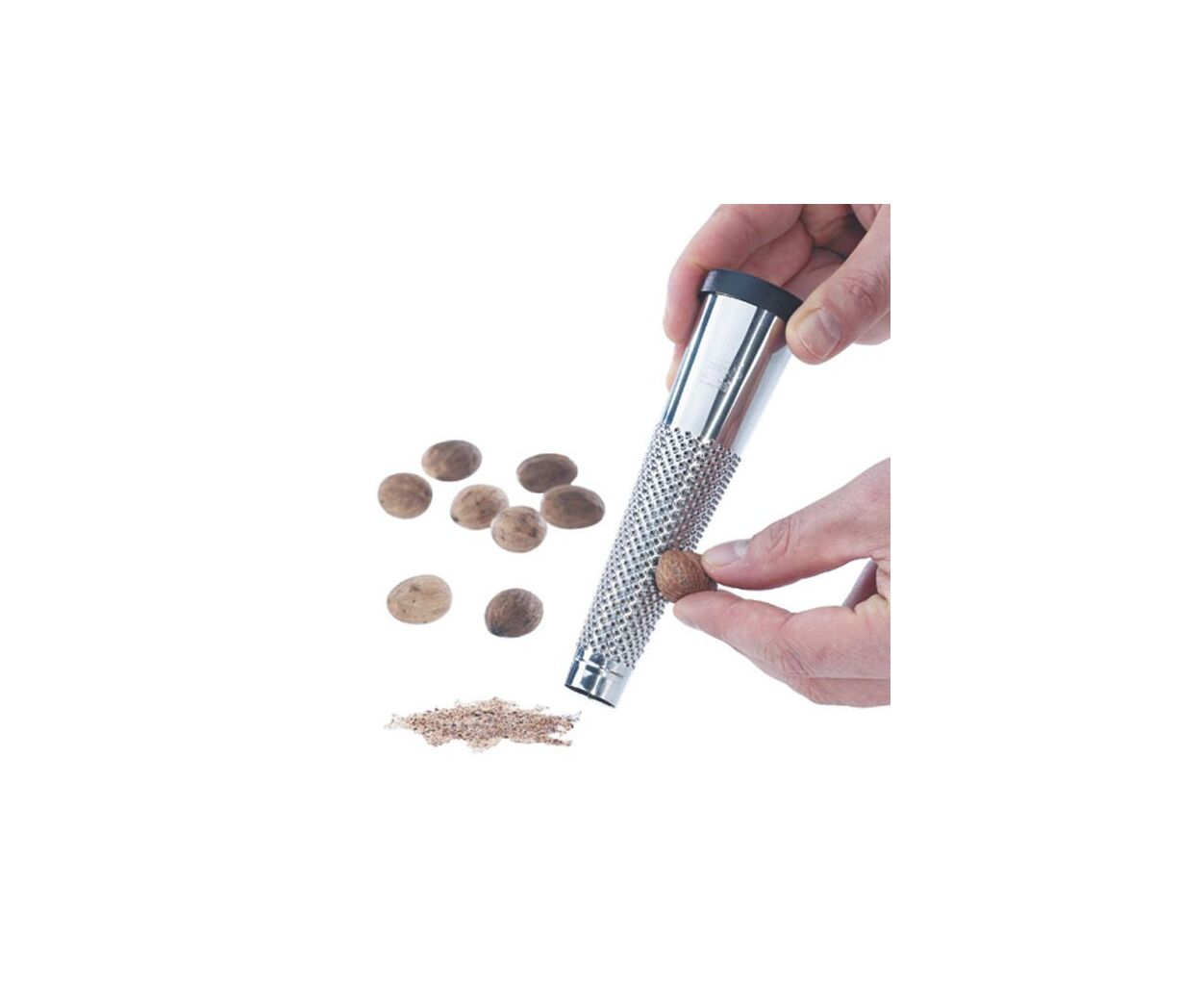 Тертка для мускатного горіха має висувний контейнер для зберігання горіхів із пластику, поверхня тертки виготовлена з нержавіючої сталі.