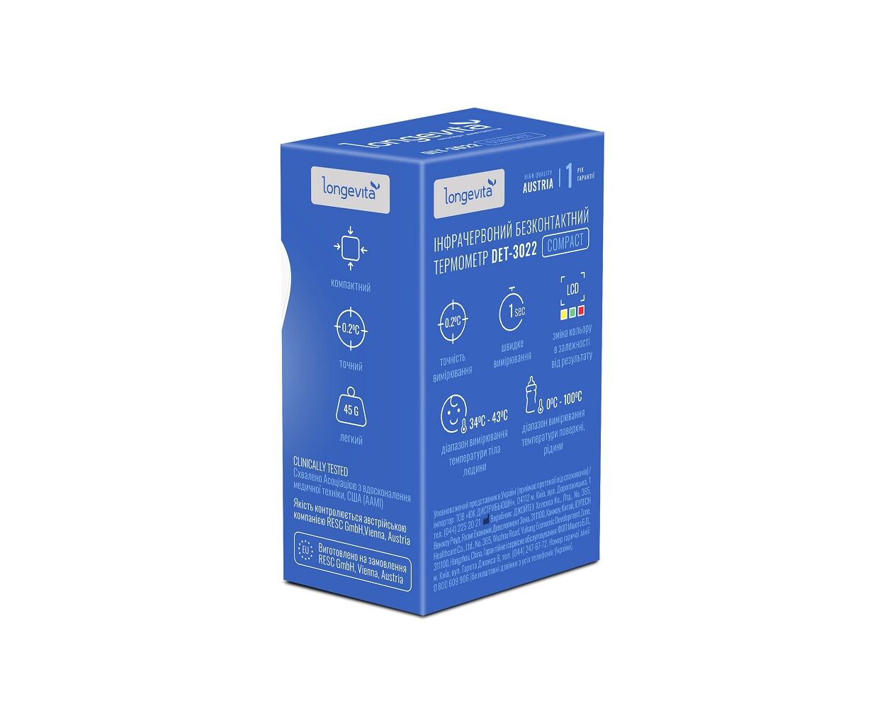 - Інфрачервоний термометр Longevita DET-3022 Compact, сертифікований в Україні та дозволений до використання в медичних установах. Має всі необхідні документи, що підтверджують якість приладу та відповідність усім вимогам тех. регламенту №753.