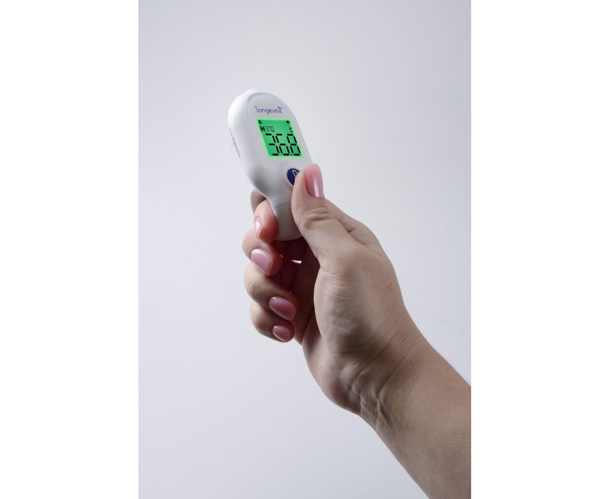 Безконтактний інфрачервоний термометр Longevita DET-3022 Compact має спеціальний інфрачервоний датчик, який вловлює тепло від тіла, фіксує і виводить показник на екран. Водночас, на відміну від звичайних ртутних або електронних термометрів, йому для визначення температури потрібна лише 1 (одна) секунда! Результати вимірювання точні (похибка не перевищує 0,2 ℃ у діапазоні 34-43 ℃), тому безконтактний інфрачервоний термометр Longevita DET-3022 Compact дозволений до використання в медичних установах.