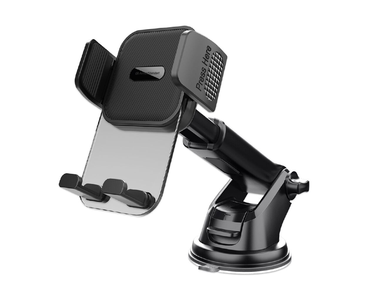 Тримач оснащений потужною вакуумною присоскою та складним регульованим кронштейном, який дозволяє налаштувати положення смартфона на потрібній висоті та відстані. Надійна фіксація забезпечує стабільне утримання смартфона навіть під час поїздок нерівними дорогами або різких маневрів.