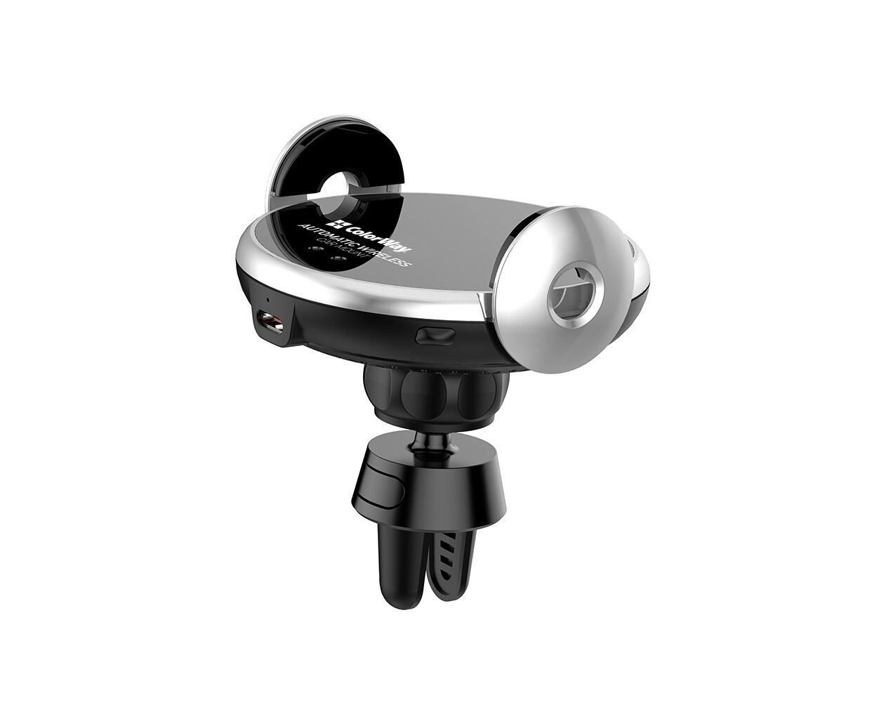 Бездротовий зарядний пристрій ColorWay AutoSense Car Wireless Charger 2 10W Black для смартфона з автоматичним затискачем, який допомагає водієві практично не відволікатися від дороги, завдяки своїм компактним розмірам, і зручно користуватися улюбленим смартфоном одночасно заряджаючи його. Просто піднесіть ваш смартфон до порожньої підставки, вбудований датчик точно визначить момент установки гаджета на тримач, і призведе в рух бічні рамки, які зупиняться відразу після того, як щільно і акуратно охоплять смартфон. Коли вам необхідно витягти смартфон з тримача, вам просто потрібно натиснути на бічну кнопку панелі і два затиски автоматично розімкнуться. Тримач легко кріпиться на решітці дефелектора, а висока міцність кріплення виключить випадання навіть при сильній трясці. Прорезинена кліпса і лапки попередить появу подряпин як на самому пристрої так і на вентиляційній рещитці. Механізм обертання на 360 градусів дозволить закріпити смартфон в зручному для Вас положенні. На додаток до можливості надійної фіксації смартфона, автомобільний тримач ColorWay AutoSense Car Wireless Charger 2 має вбудовану бездротову зарядку потужністю 10 Вт, що дозволить зарядити смартфон з високою швидкістю. Зарядний пристрій оснащений розумним чіпом для захисту ваших пристроїв від короткого замикання , перенапруги, перегріву і перевантаження по струму.