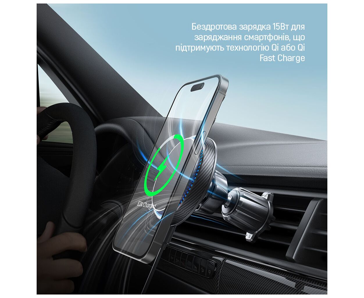 - Магнітне кріплення MagSafe гарантує бездоганне співпадіння котушок з моделями iPhone 12 і новішими, забезпечуючи максимальний комфорт і ефективність під час зарядки. Для кріплення телефонів без підтримки MagSafe, автотримач комплектується металевим кільцем для наклейки на чохол або телефон