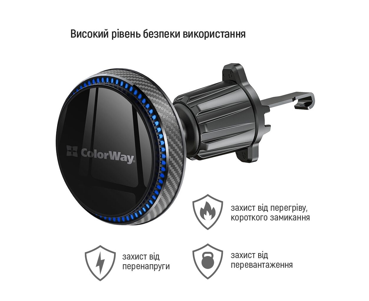 Магнітний автотримач ColorWay MagSafe 360° Air Vent 15W Black (CW-CHMW041Q-BK), оснащений бездротовою зарядкою на 15W, гарантує швидке та надійне заряджання вашого смартфону за допомогою технології Qi або Qi Fast Charge. Цей тримач ідеально сумісний з телефонами Apple MagSafe*, дозволяючи точно розташувати телефон для максимальної ефективності зарядки. Магнітний автотримач MagSafe ColorWay в комплекті має додаткове металеве кільце, що розширює його сумісність не лише з Mafsafe. Ви можете легко прикріпити це кільце до вашого смартфона або чохла, щоб забезпечити сумісність з пристроями Mafsafe. Завдяки 17 міцним магнітам ваш телефон буде надійно закріплений, навіть під час поїздок по нерівній дорозі. Інтуїтивно зрозуміла кругова світлодіодна індикація спрощує контроль над процесом зарядки. Оновлена конструкція кріплення гарантує стійку фіксацію та сумісність з різними типами дефлекторних решіток. Завдяки поворотному шарніру на 360° ви можете налаштувати оптимальний кут нахилу для вашого комфорту. Крім того, тримач забезпечує захист від перенапруги, перенавантаження та перегріву, що забезпечує безпеку вашого пристрою..