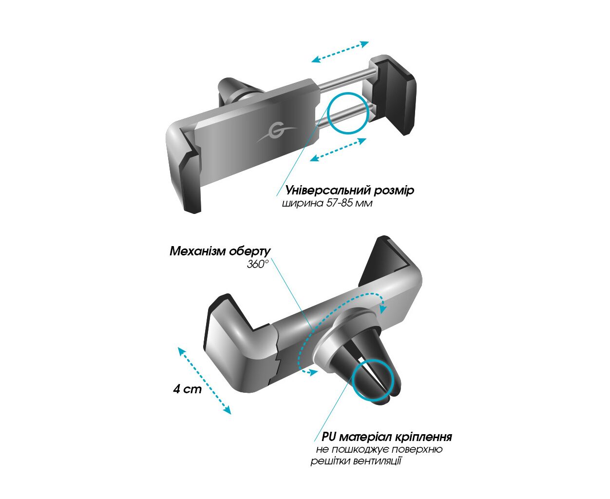 Global Hold M05GH Black - Автомобільний тримач для телефонів. З його допомогою ви без проблем зможете тримати телефон в поле зору, прокладати маршрут за допомогою навігатора, а також приймати дзвінки по гучному зв'язку. Тип кріплення даного власника є універсальним і підійде для будь-якого автомобіля, так як фіксується він на решітці системи вентиляції. Ширина розкриття затискачів кріплення регулюється від 57 до 85 мм, це дозволяє встановити практично будь-який з сучасних смартфонів.