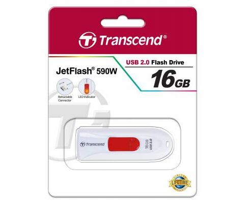 USB флеш накопичувач Transcend 16GB JetFlash 590 White USB 2.0 (TS16GJF590W) з високошвидкісним інтерфейсом Hi-Speed USB 2.0 і ємністю 16GB максимально спростить зберігання, перенесення і розповсюдження будь-яких цифрових файлів в дорозі. А зручна петелька дозволяє прикріпити каблучку, ланцюжок або тасьму і підвісити накопичувач на сумку або пояс.