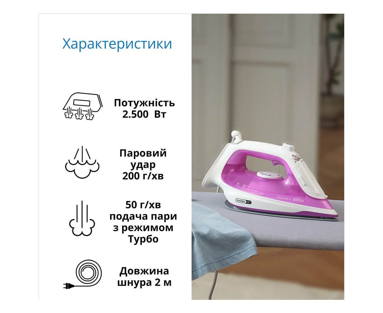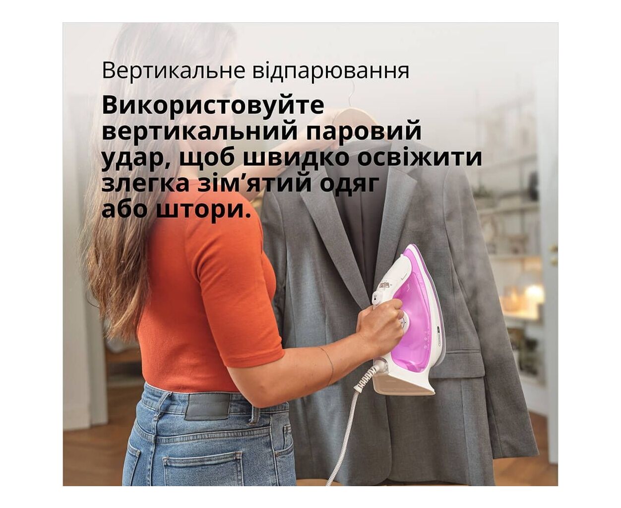 Вертикальне відпарювання: Функція вертикального відпарювання дає можливість швидко освіжити одяг або штори, не використовуючи прасувальну дошку.