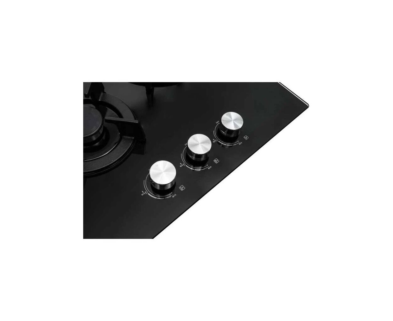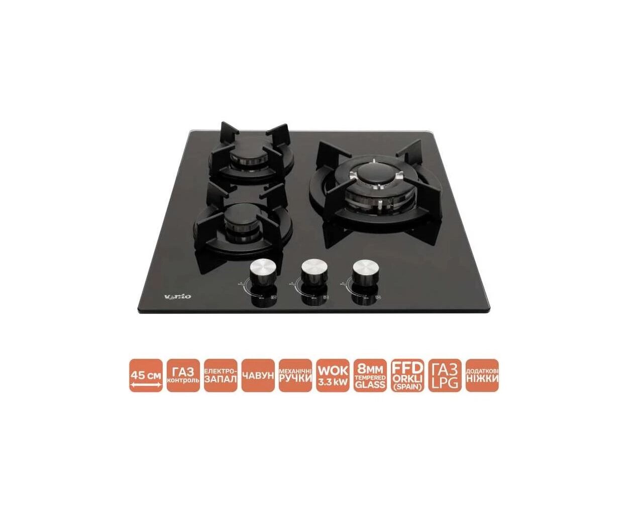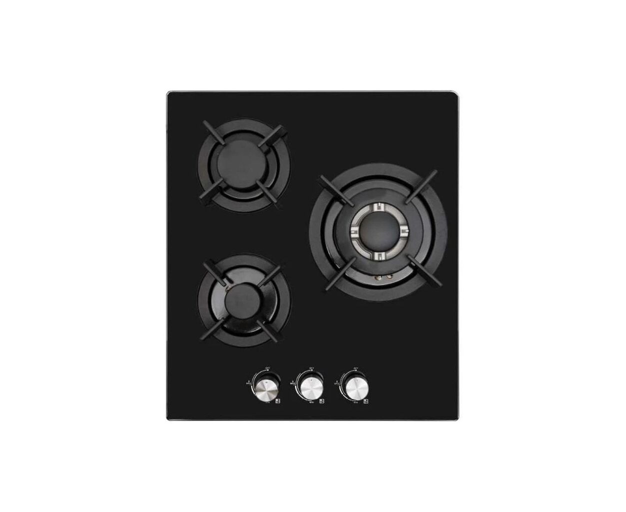 Тип поверхні - газова, газові конфорки, загартоване скло, кількість конфорок - 3, Задня ліва 1.75 кВт, Передня ліва 1 кВт, Передня 3.3 кВт, Управління - механічне, Газ-контроль - так, Електропідпал - так, Матеріал решіток - чавун, бутан/зріджений, 220 В, Розміри ніші для вбудовування - 5 х 40.5 х 47.5 см, 7 кг, чорний