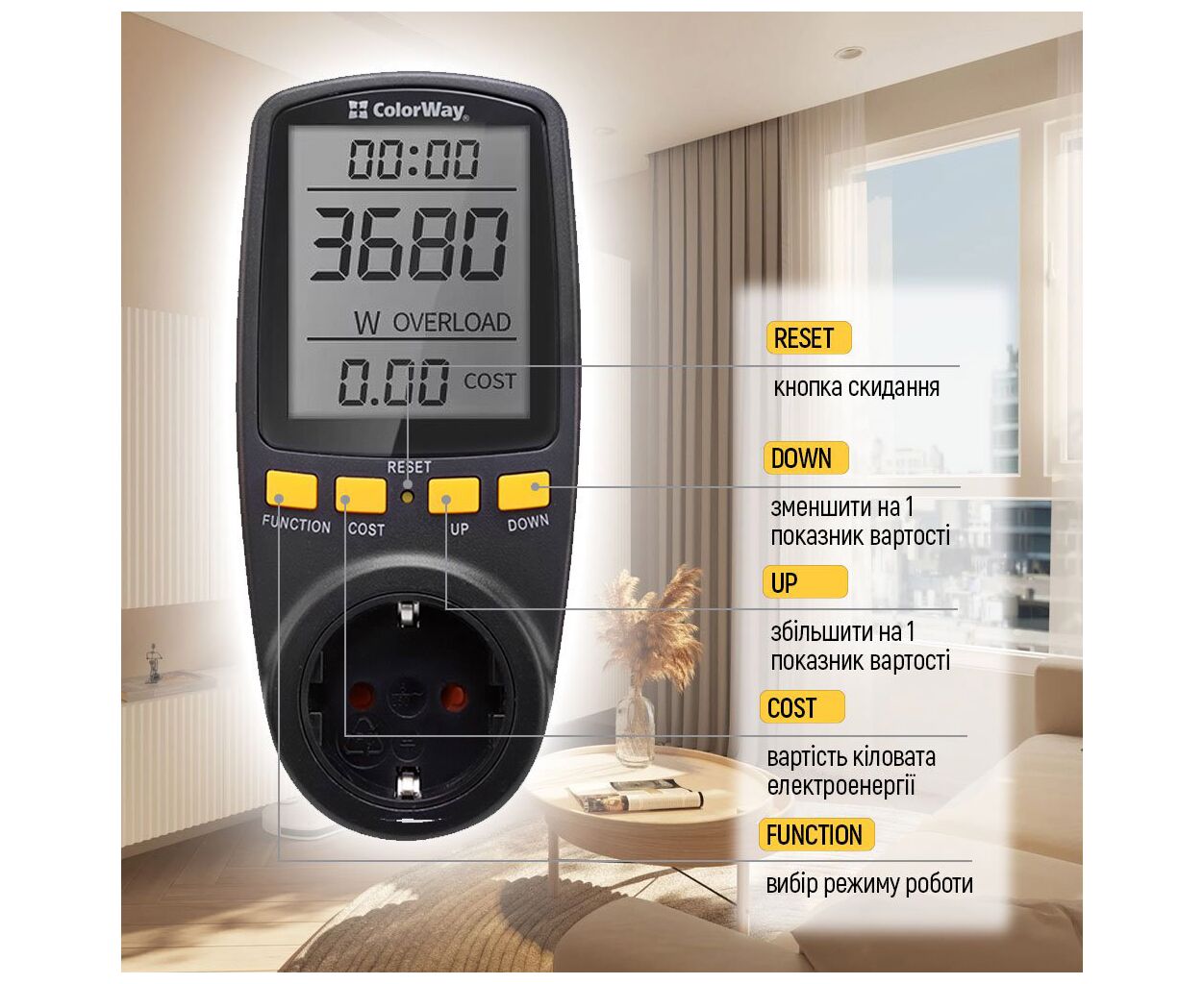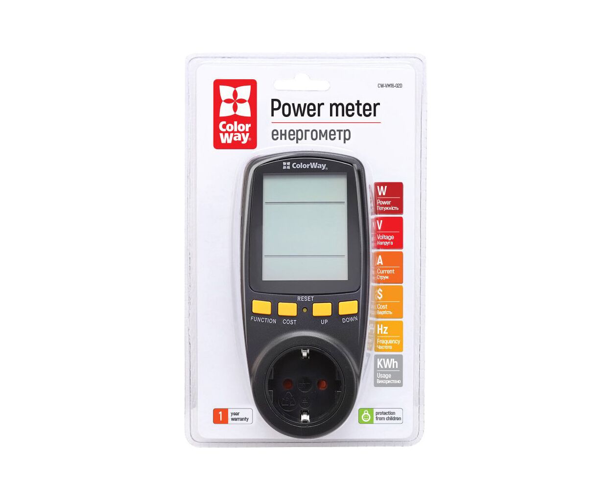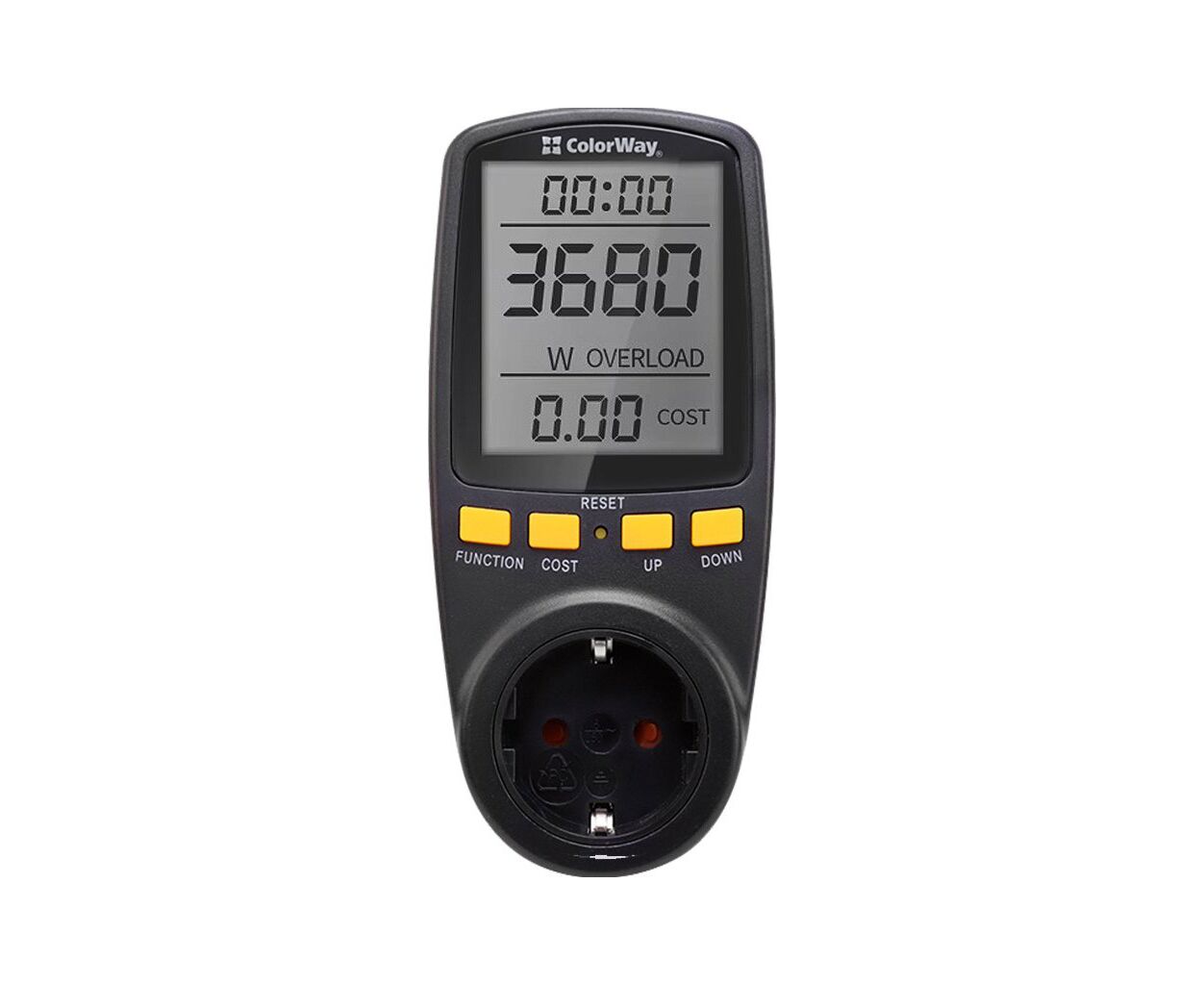 Опис Ватметр ColorWay цифровий 16A/3680W, black (CW-VM16-02D)
