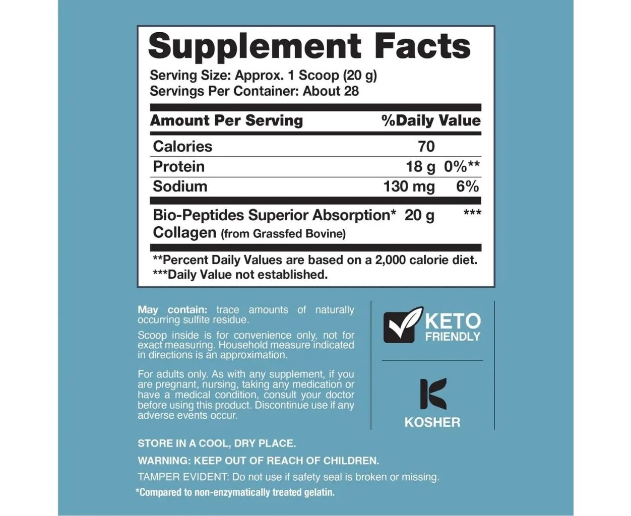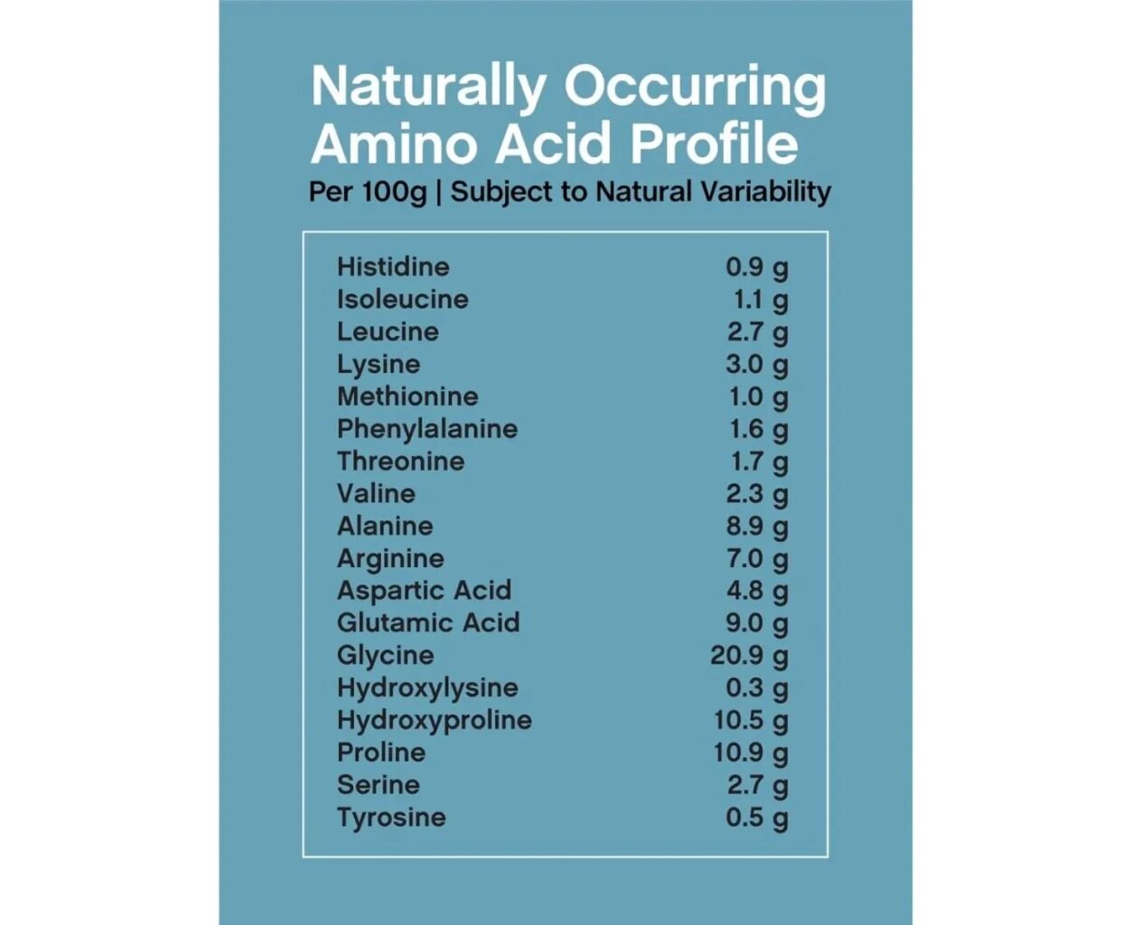 - білок 18 г 0%**, Натрій 130 мг 6%, Колагенові біопептиди чудового засвоєння (з корів, вирощених на трав'яному відгодівлі) 20 г ***, Профіль природних амінокислот на 100 г, Гістідін 0,9 г, Ізолейцин 1,1 г, Лейцин 2,7 г, Лізін 3 г, Метіонін 1 г, Фенілаланін